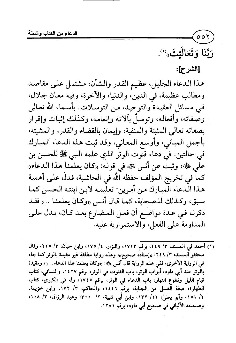 (¬1) أحمد في المسند، 3/ 249، برقم 1723، والبزار، 4/ 175، وابن حبان، 3/ 225، وقال محققو المسند، 3/ 249: ((إسناده صحيح))، وهذه رواية مطلقة غير مقيدة بالوتر كما جاء في الرواية الأخرى، ففي هذه الرواية قال أنس - رضي الله عنه -: ((وكان يعلمنا هذا الدعاء ... ))، ومقيدة بالوتر عند أبي داود، أبواب الوتر، باب القنوت في الوتر، برقم 1427، والنسائي، كتاب قيام الليل وتطوع النهار، باب الدعاء في الوتر، برقم 1745، وله في الكبرى، كتاب الطهارة، صفة الغسل من الجنابة، برقم 1446، والحاكم، 3/ 172، وابن خزيمة،