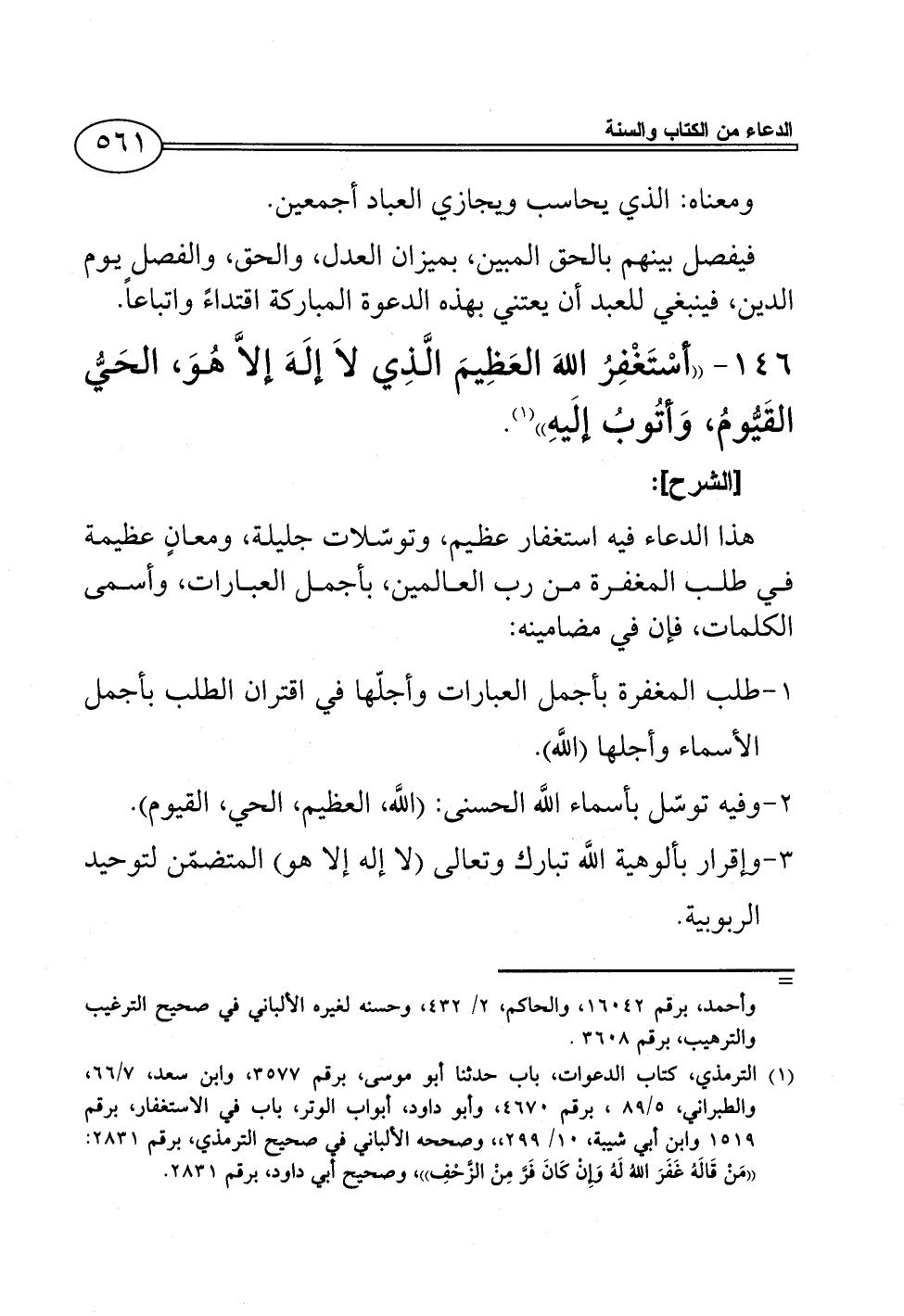 146 - ((أسْتَغْفِرُ اللهَ العَظِيمَ الَّذِي لاَ إلَهَ إلاَّ هُوَ، الحَيُّ القَيُّومُ، وَأتُوبُ إلَيهِ)) (¬2).