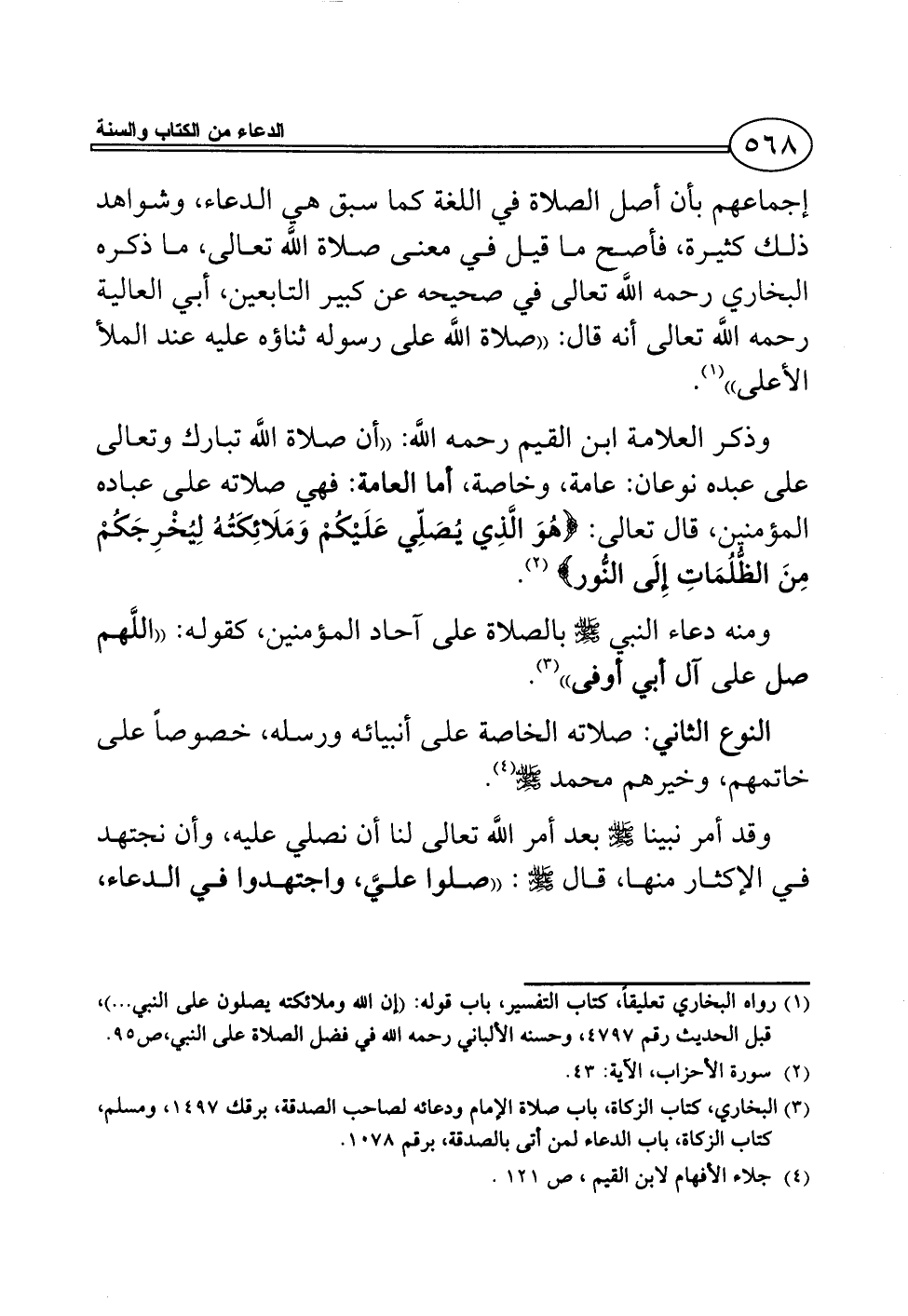 وذكر العلامة ابن القيم رحمه اللَّه: ((أن صلاة اللَّه تبارك وتعالى على عبده نوعان: عامة، وخاصة, أما العامة: فهي صلاته على عباده المؤمنين, قال تعالى: {هُوَ الَّذِي يُصَلِّي عَلَيْكُمْ وَمَلَائِكَتُهُ لِيُخْرِجَكُمْ مِنَ الظُّلُمَاتِ إِلَى النُّور} (¬2).