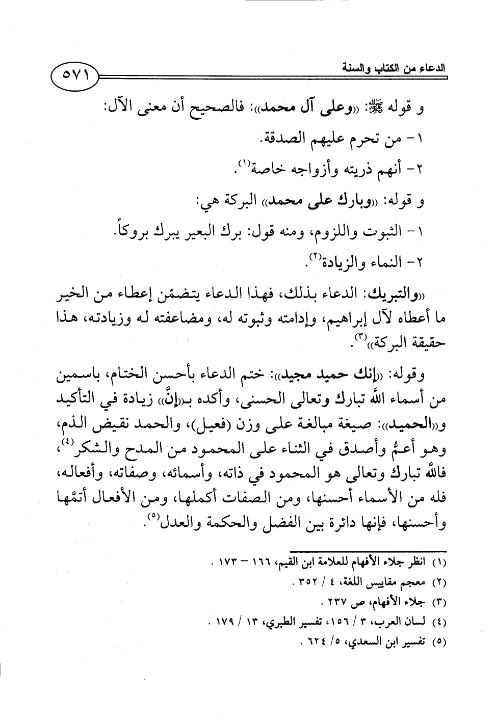 ((والتبريك: الدعاء بذلك، فهذا الدعاء يتضمّن إعطاء من الخير ما أعطاه لآل إبراهيم, وإدامته وثبوته له, ومضاعفته له وزيادته, هذا حقيقة البركة)) (¬4).