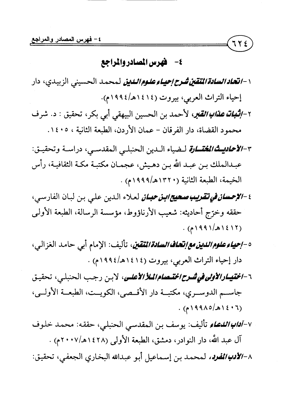 1 - اتحاد السادة المتقين شرح إحياء علوم الدين لمحمد الحسيني الزبيدي، دار إحياء التراث العربي، بيروت (1414هـ/1994م).