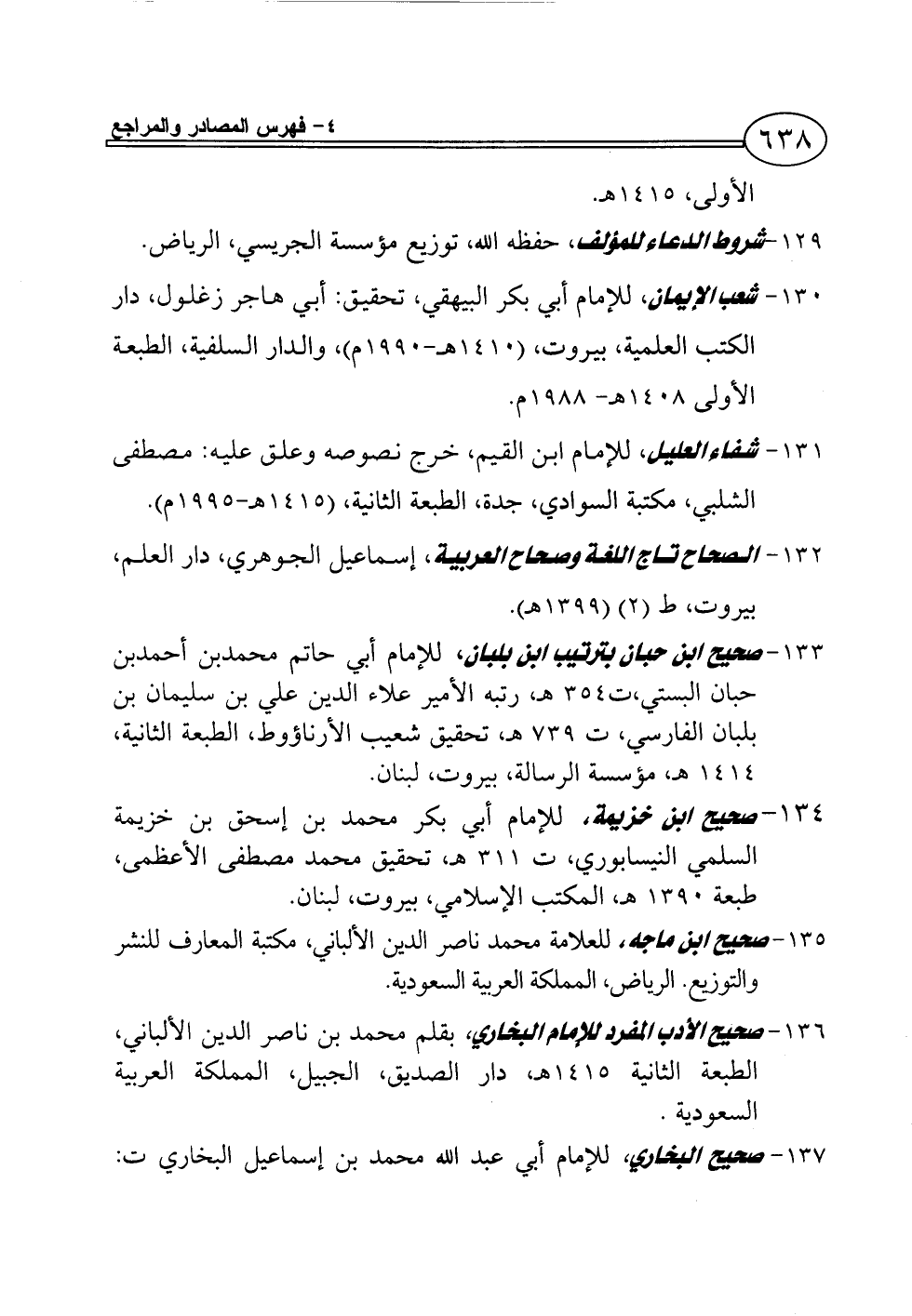 134 - صحيح ابن خزيمة، للإمام أبي بكر محمد بن إسحق بن خزيمة السلمي النيسابوري، ت 311 هـ، تحقيق محمد مصطفى الأعظمى، طبعة 1390 هـ، المكتب الإسلامي، بيروت، لبنان.