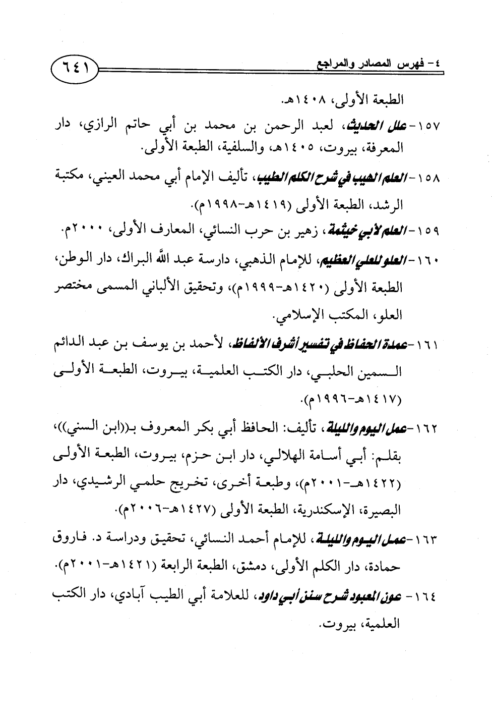 163 - عمل اليوم والليلة، للإمام أحمد النسائي، تحقيق ودراسة د. فاروق حمادة، دار الكلم الأولى، دمشق، الطبعة الرابعة (1421هـ-2001م).