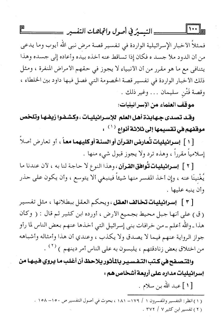 [1] إسرائيليات تعارض القرآن أو السنة أو كليهما معا، أو تعارض أصلا إسلاميا مقررا، وهذه ترد ولا يجوز قبول شيء منها.