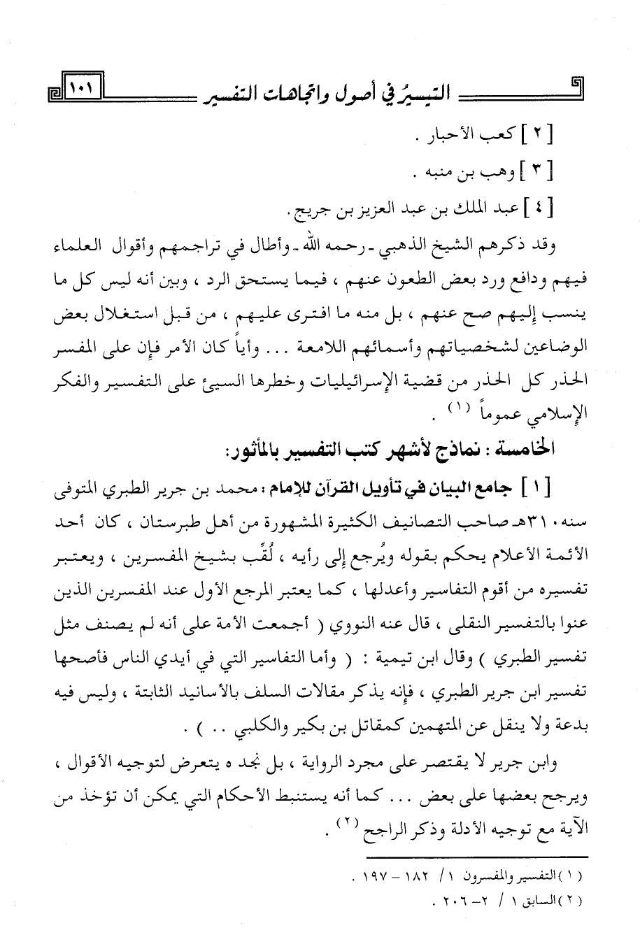 [1] جامع البيان في تأويل القرآن للإمام: محمد بن جرير الطبري المتوفي سنة 310 هـ صاحب التصانيف الكثيرة المشهورة من أهل طبرستان، كان أحد الأئمة الأعلام يحكم بقوله ويرجع إلي رأيه، لقّب بشيخ المفسرين، ويعتبر تفسيره من أقوم التفاسير وأعدلها، كما يعتبر المرجع الأول عند المفسرين الذين عنوا بالتفسير النقلي، قال عنه النووي: (أجمعت الأمة على أنه لم يصنف مثل تفسير الطبري) وقال ابن تيمية: (وأما التفاسير التي في أيدي الناس فأصحها تفسير ابن جرير الطبري، فإنه يذكر مقالات السلف بالأسانيد الثابتة، وليس فيه بدعة ولا ينقل عن المتهمين كمقاتل بن بكير والكلبي ..).