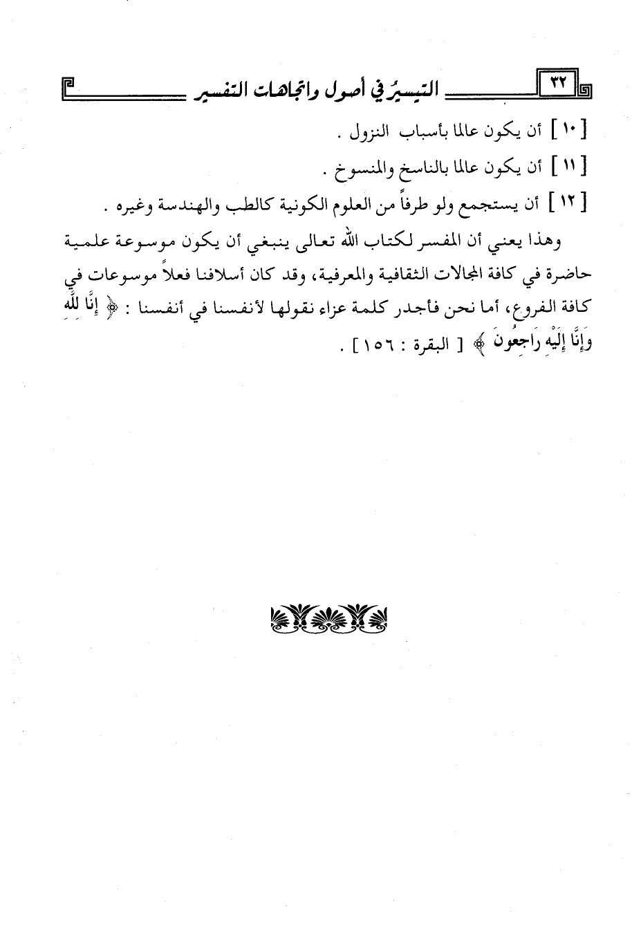 وهذا يعني أن المفسر لكتاب الله تعالى ينبغي أن يكون موسوعة علمية حاضرة في كافة المجالات الثقافية والمعرفية، وقد كان أسلافنا فعلا موسوعات في كافة الفروع، أما نحن فأجدر كلمة عزاء نقولها لأنفسنا في أنفسنا: إِنَّا لِلَّهِ وإِنَّا إِلَيْهِ راجِعُونَ [البقرة: 156].