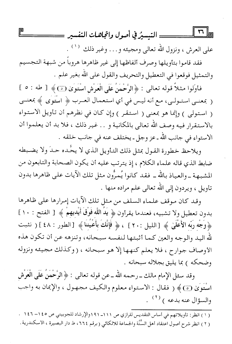 فأولوا مثلا قوله تعالى: الرَّحْمنُ عَلَي الْعَرْشِ اسْتَوي (1) [طه: 5] (بمعنى استولى، مع أنه ليس في أي استعمال العرب اسْتَوى بمعنى (استولى) وإنما هو بمعنى (استقر) وإن كان في نظرهم أن تأويل الاستواء بالاستقرار فيه وصف الله تعالى بالمكانية و .. غير ذلك، فلا بد أن يعلموا أن الاستواء في جانب الله - عز وجل - يختلف عنه في جانب خلقه.