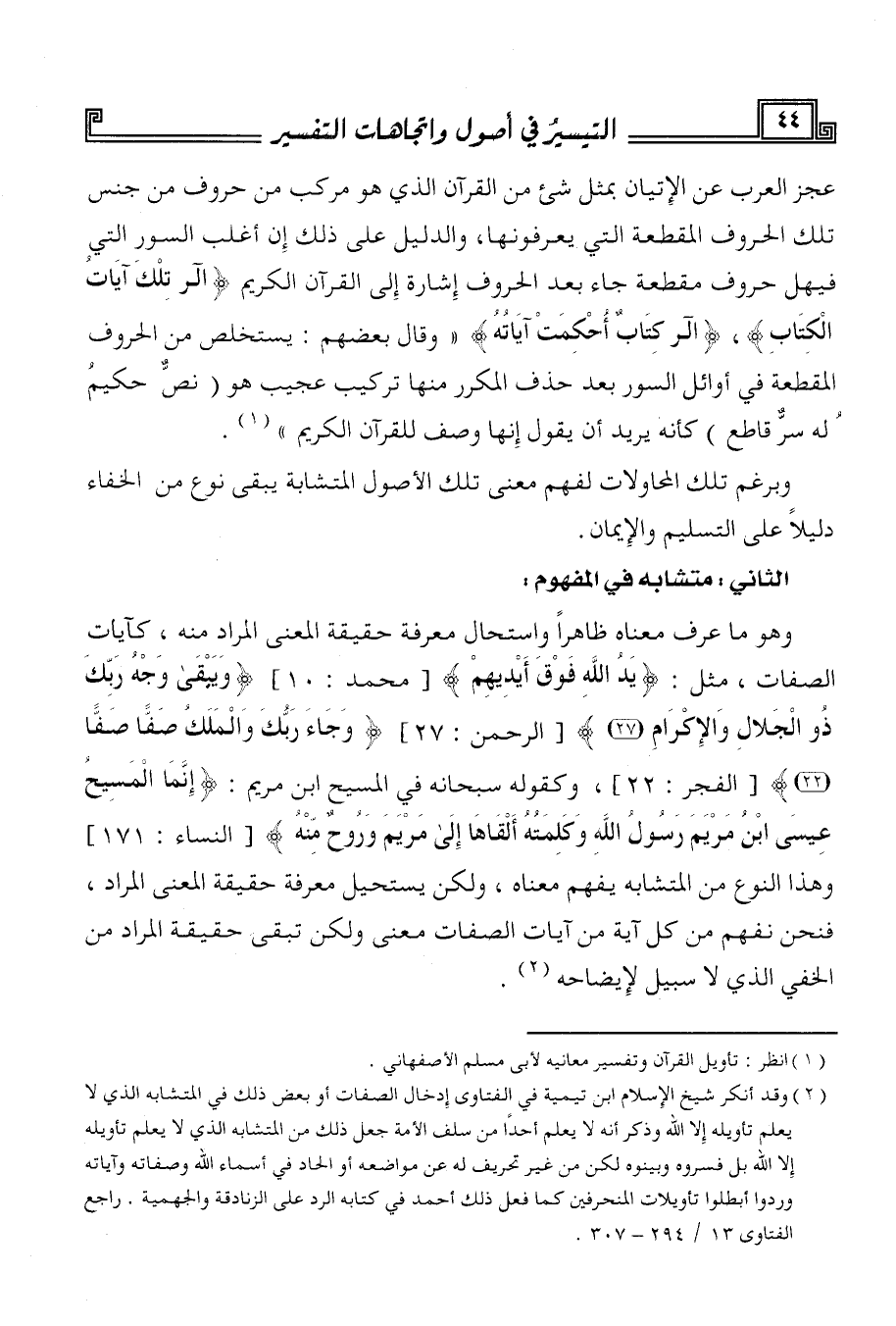 (¬2) وقد أنكر شيخ الإسلام ابن تيمية في الفتاوي إدخال الصفات أو بعض ذلك في المتشابه الذي لا يعلم تأويله إلا الله وذكر أنه لا يعلم أحدا من سلف الأمة جعل ذلك من المتشابه الذي لا يعلم تأويله إلا الله بل فسروه وبينوه لكن من غير تحريف له عن مواضعه أو الحاد في أسماء الله وصفاته وآياته وردوا أبطلوا تأويلات المنحرفين كما فعل ذلك أحمد في كتابه الرد على الزنادقة والجهمية. راجع الفتاوي 13/ 294 - 307.