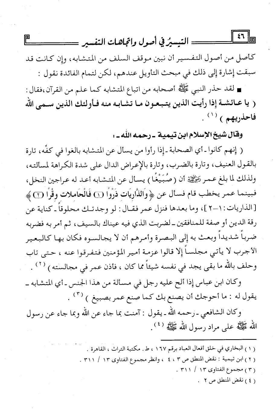وقال شيخ الإسلام ابن تيمية - رحمه الله -: (إنهم كانوا - أي الصحابة - إذا رأوا من يسأل عن المتشابه بالغوا في كفّه، تارة بالقول العنيف، وتارة بالضرب، وتارة بالإعراض الدال على شدة الكراهة لمسألته، ولذلك لما بلغ عمر رضي الله عنه أن (صبيغا) يسأل عن المتشابه أعد له عراجين النخل، فبينما عمر يخطب قام فسأل عن والذَّارِياتِ ذَرْوًا 1 فَالْحامِلاتِ وِقْرًا (2) [الذاريات: 1 - 2]، وما بعدها فنزل عمر فقال: لو وجدتك محلوقا - كناية عن رقة الدين أو صفة للمنافقين - لضربت الذي فيه عيناك بالسيف، ثم أمر به فضربه ضربا شديدا وبعث به إلي البصرة وأمرهم أن لا يجالسوه فكان بها كالبعير الأجرب لا يأتي مجلسا إلا قالوا عزمة أمير المؤمنين فتفرقوا عنه، حتى تاب وحلف بالله ما بقي يجد في نفسه شيئا مما كان، فأذن عمر في مجالسته) (¬2).