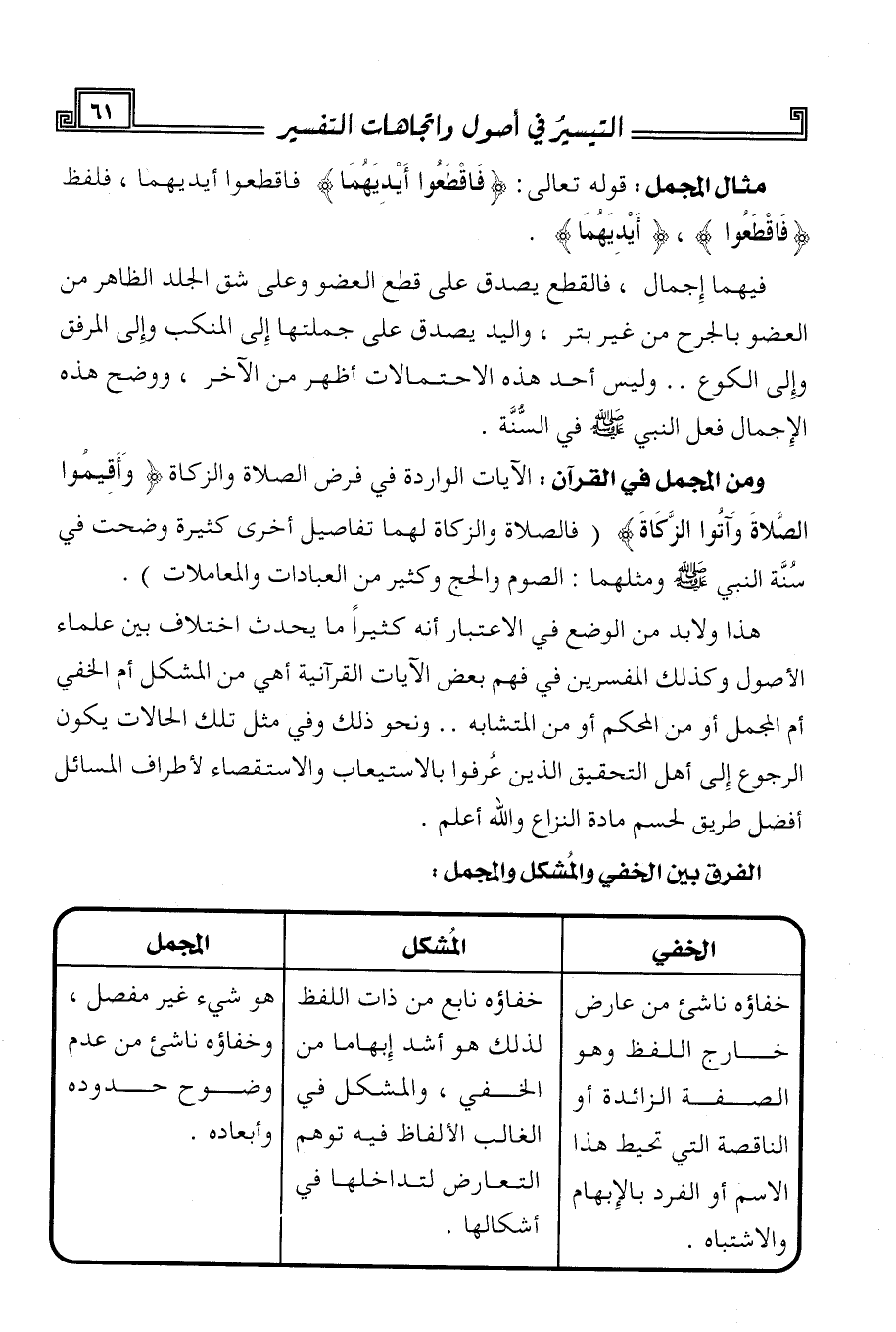 هذا ولا بد من الوضع في الاعتبار أنه كثيرا ما يحدث اختلاف بين علماء الأصول وكذلك المفسرين في فهم بعض الآيات القرآنية أهي من المشكل أم الخفي أم المجمل أو من المحكم أو من المتشابه .. ونحو ذلك وفي مثل تلك الحالات يكون الرجوع إلي أهل التحقيق الذين عرفوا بالاستيعاب والاستقصاء لأطراف المسائل أفضل طريق لحسم مادة النزاع والله أعلم.