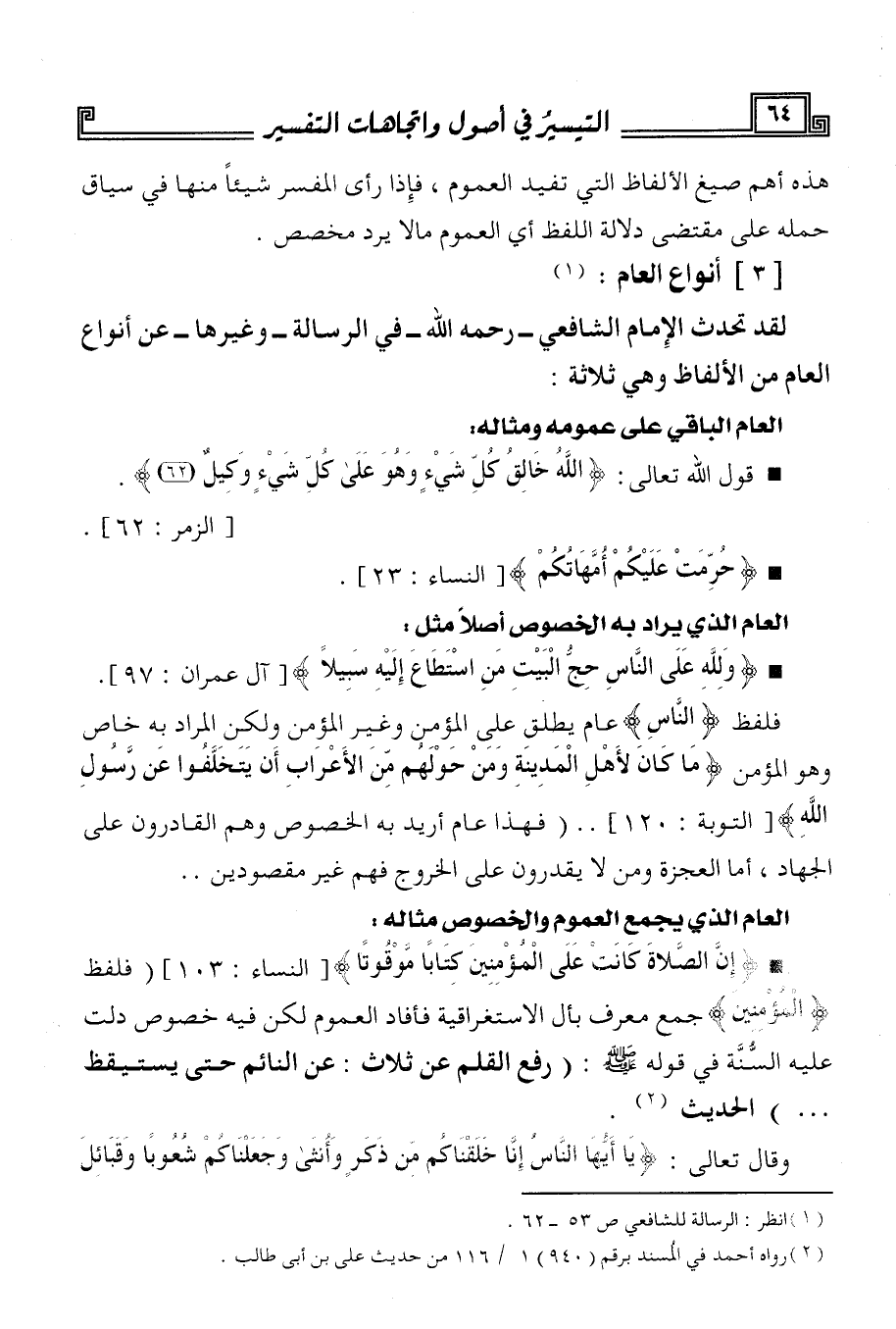 فلفظ النَّاسِ عام يطلق على المؤمن وغير المؤمن ولكن المراد به خاص وهو المؤمن ما كانَ لِأَهْلِ الْمَدِينَةِ ومَنْ حَوْلَهُمْ مِنَ الْأَعْرابِ أَنْ يَتَخَلَّفُوا عَنْ رَسُولِ اللَّهِ [التوبة: 120] .. (فهذا عام أريد به الخصوص وهم القادرون على الجهاد، أما العجزة ومن لا يقدرون على الخروج فهم غير مقصودين ..
