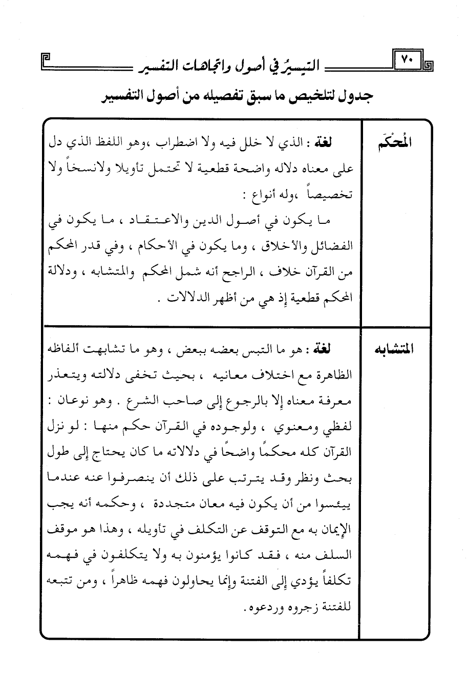 جدول لتلخيص ما سبق تفصيله من أصول التفسير