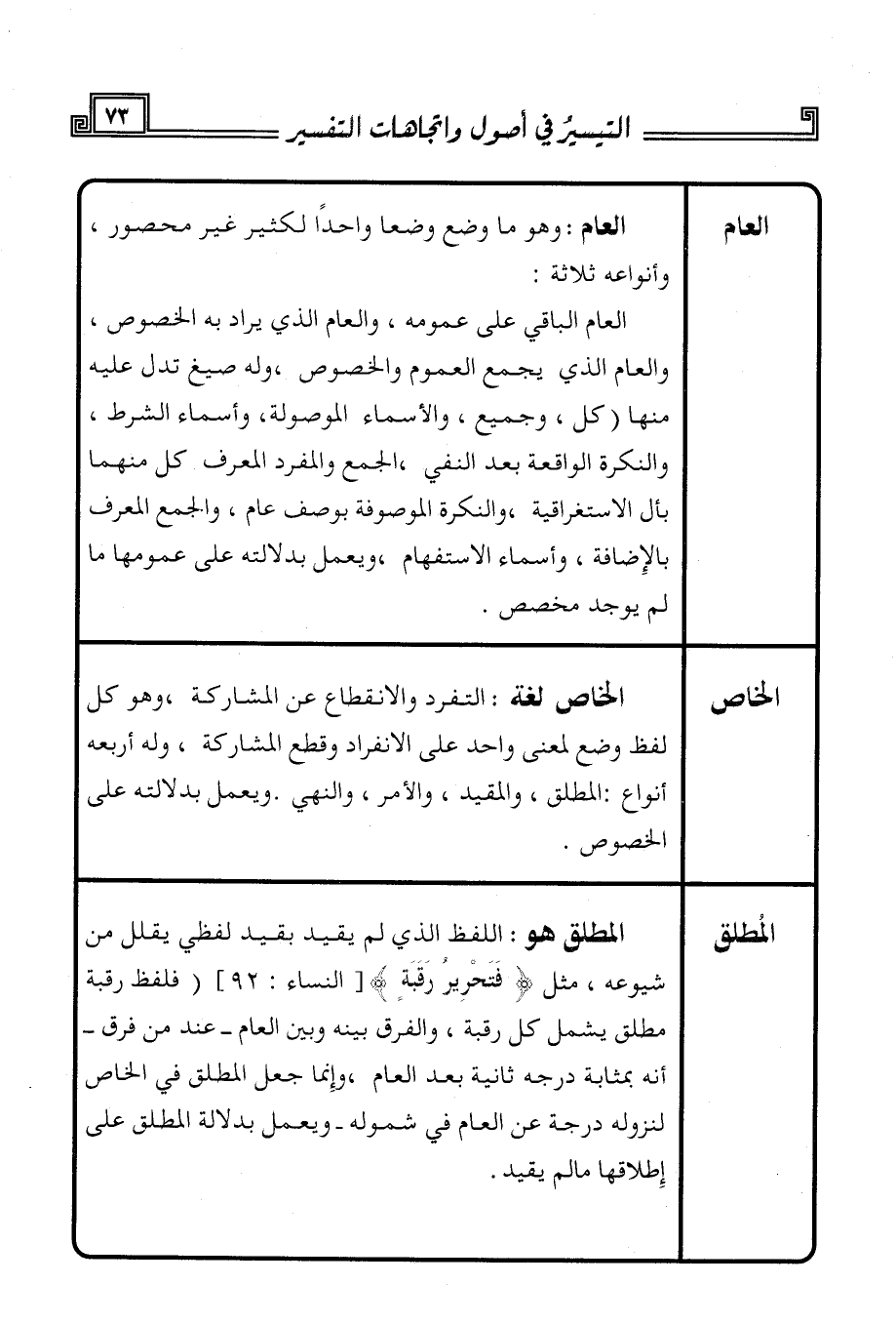 المطلق/ المطلق هو: اللفظ الذي لم يقيد بقيد لفظي يقلل من شيوعه، مثل فَتَحْرِيرُ رَقَبَةٍ [النساء: 92] (فلفظ رقبة مطلق يشمل كل رقبة، والفرق بينه وبين العام - عند من فرق - أنه بمثابة درجه ثانية بعد العام، وإنما جعل المطلق في الخاص لنزوله درجة عن العام في شموله - ويعمل بدلالة المطلق على إطلاقها ما لم يقيد.