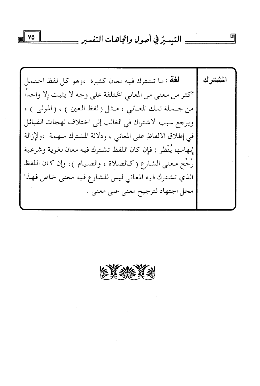 المشترك/ لغة: ما تشترك فيه معان كثيرة، وهو كل لفظ احتمل أكثر من معنى من المعاني المختلفة على وجه لا يثبت إلا واحدا من جملة تلك المعاني، مثل (لفظ العين)، (المولي)، ويرجع سبب الاشتراك في الغالب إلي اختلاف لهجات القبائل في إطلاق الألفاظ على المعاني، ودلالة المشترك مبهمة، ولإزالة إبهامها ينظر: فإن كان اللفظ تشترك فيه معان لغوية وشرعية رجّح معنى الشارع (كالصلاة، والصيام)، وإن كان اللفظ الذي تشترك فيه المعاني ليس للشارع فيه معنى خاص فهذا محل اجتهاد لترجيح معنى على معنى.