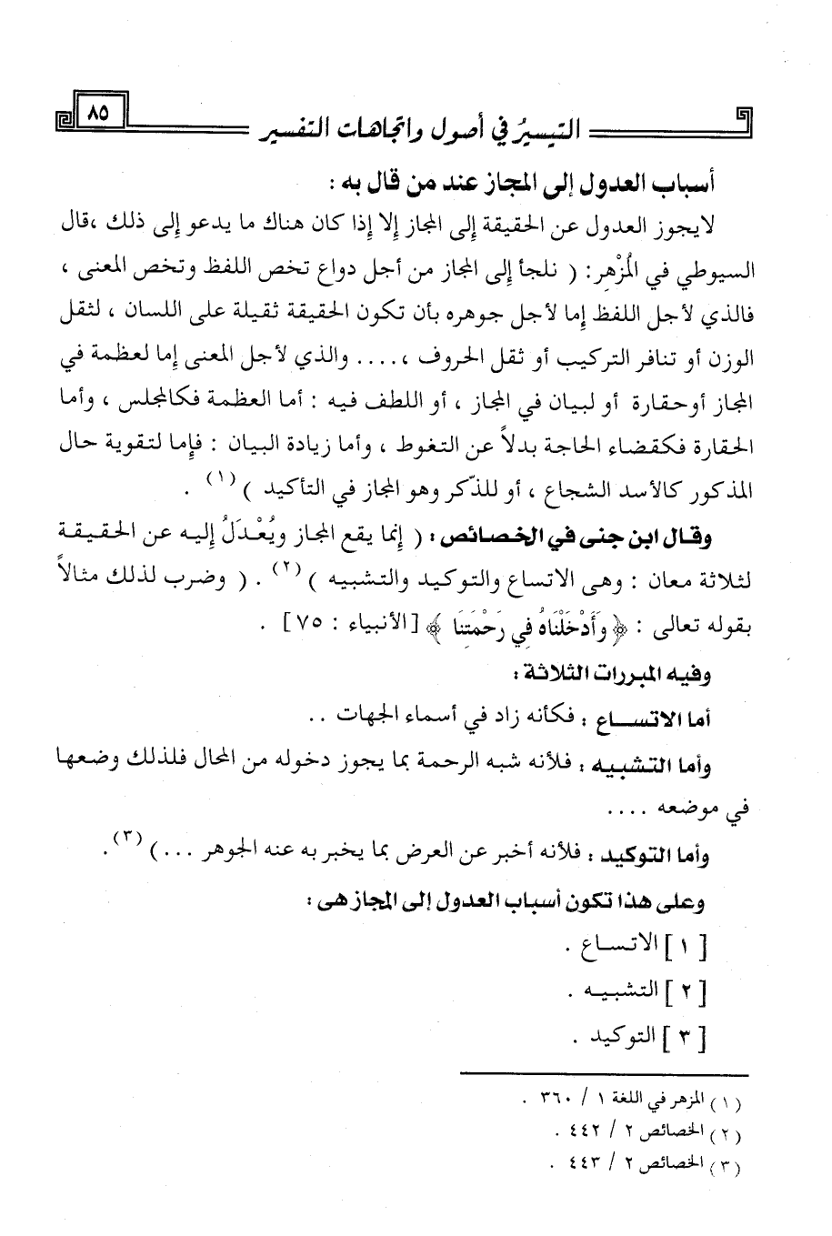 وقال ابن جني في الخصائص: (إنما يقع المجاز ويعدل إليه عن الحقيقة لثلاثة معان: وهي الاتساع والتوكيد والتشبيه) (¬2). (وضرب لذلك مثالا بقوله تعالى: وأَدْخَلْناهُ فِي رَحْمَتِنا [الأنبياء: 75].