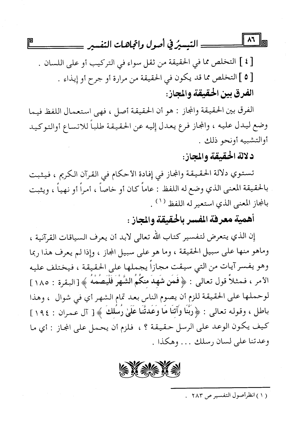 إن الذي يتعرض لتفسير كتاب الله تعالى لا بدّ أن يعرف السياقات القرآنية، وما هو منها على سبيل الحقيقة، وما هو على سبيل المجاز، وإذا لم يعرف هذا ربما وهو يفسر آيات من التي سيقت مجازا يجملها على الحقيقة، فيختلف عليه الأمر، فمثلا قوله تعالى: فَمَنْ شَهِدَ مِنْكمُ الشَّهْرَ فَلْيَصُمْهُ [البقرة: 185] لو حملها على الحقيقة للزم أن يصوم الناس بعد تمام الشهر أي في شوال، وهذا باطل، وقوله تعالى: رَبَّنا وآتِنا ما وَعَدْتَنا عَلي رُسُلِك [آل عمران: 194] كيف يكون الوعد على الرسل حقيقة؟، فلزم أن يحمل على المجاز: أي ما وعدتنا على لسان رسلك ... وهكذا.