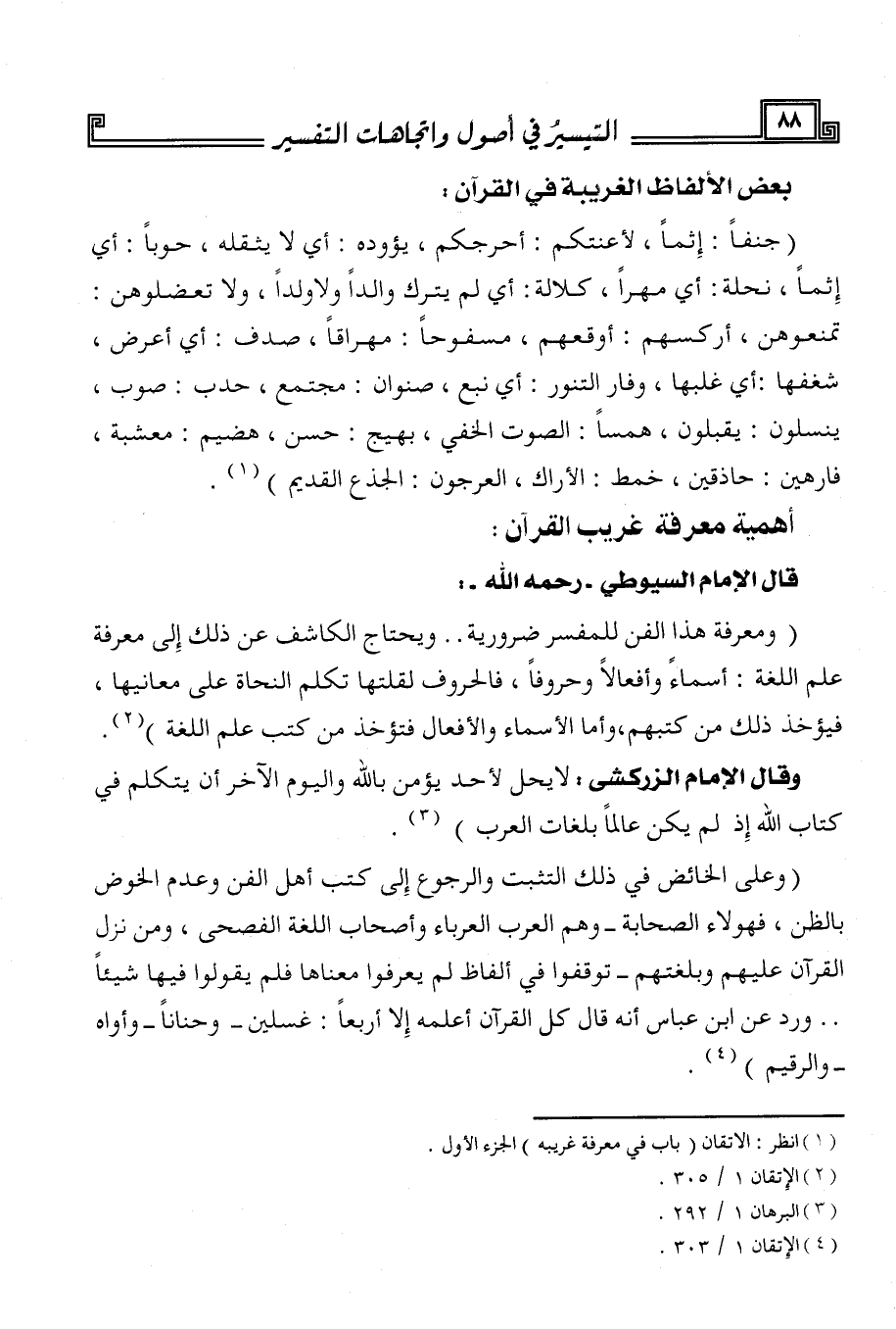 (وعلى الخائض في ذلك التثبت والرجوع إلي كتب أهل الفن وعدم الخوض بالظن، فهؤلاء الصحابة - وهم العرب العرباء وأصحاب اللغة الفصحي، ومن نزل القرآن عليهم وبلغتهم - توقفوا في ألفاظ لم يعرفوا معناها فلم يقولوا فيها شيئا .. ورد عن ابن عباس أنه قال كل القرآن أعلمه إلا أربعا: غسلين - وحنانا - وأواه - والرقيم) (¬4).