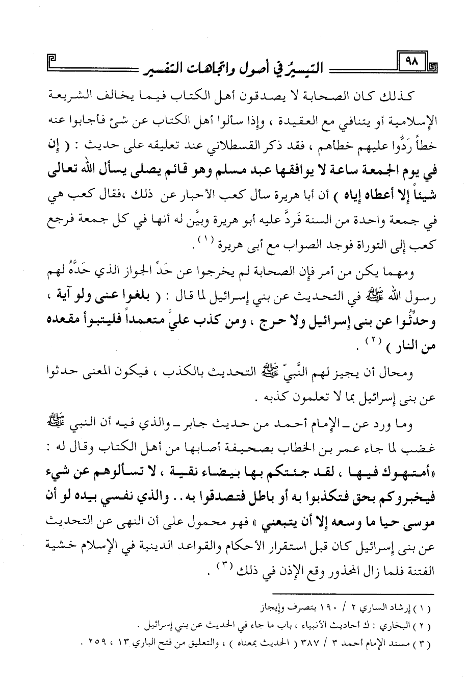 وما ورد عن - الإمام أحمد من حديث جابر - والذي فيه أن النبي صَلَّى اللهُ عَلَيْهِ وَسَلَّمَ غضب لما جاء عمر بن الخطاب بصحيفة أصابها من أهل الكتاب وقال له: «أمتهوك فيها، لقد جئتكم بها بيضاء نقية، لا تسألوهم عن شيء فيخبروكم بحق فتكذبوا به أو باطل فتصدقوا به .. والذي نفسي بيده لو أن موسي حيا ما وسعه إلا أن يتبعني» فهو محمول على أن النهي عن التحديث عن بني إسرائيل كان قبل استقرار الأحكام والقواعد الدينية في الإسلام خشية الفتنة فلما زال المحذور وقع الإذن في ذلك (¬3).