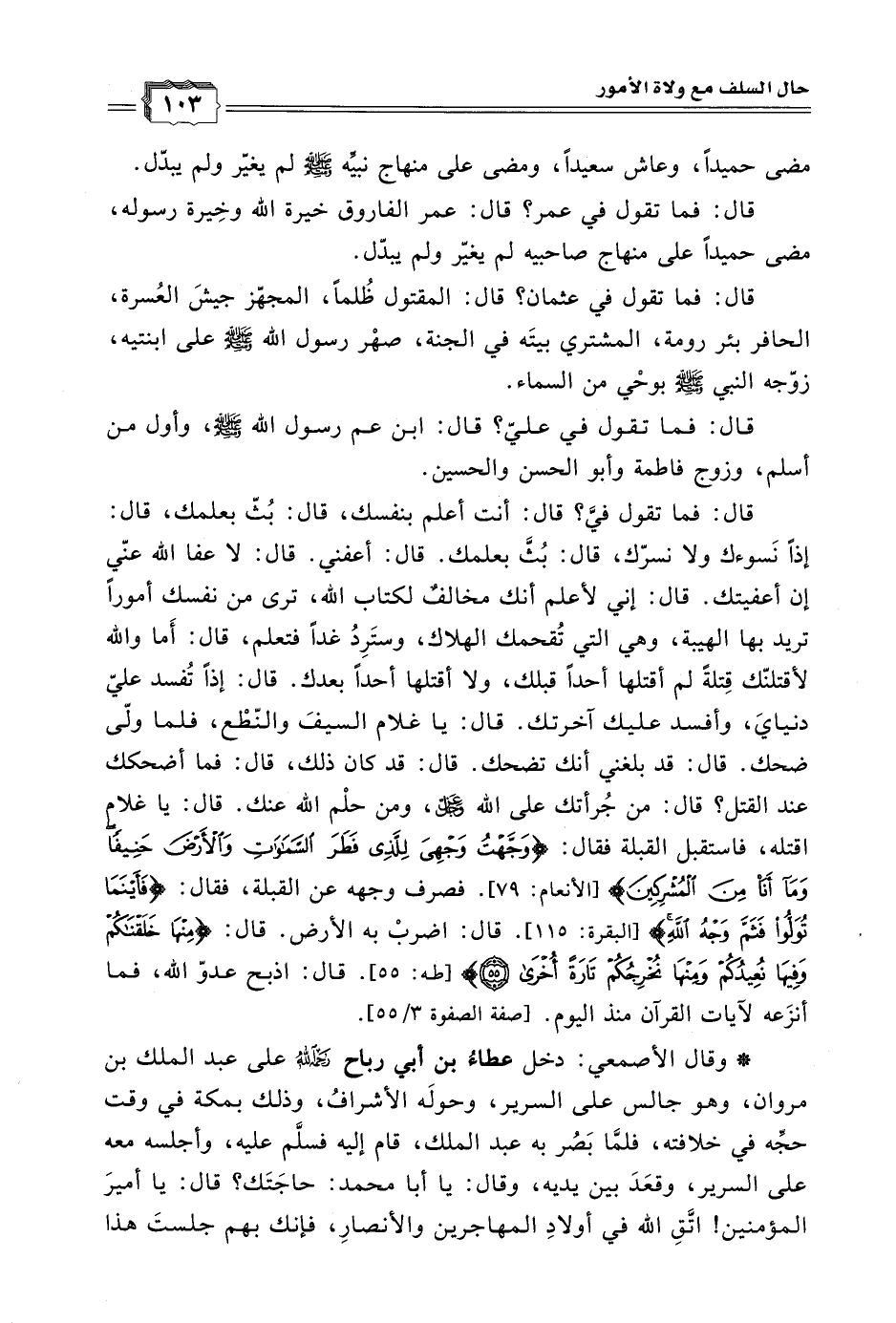 * وقال الأصمعي: دخل عطاءُ بن أبي رباح رحمه الله على عبد الملك بن مروان، وهو جالس على السرير، وحولَه الأشرافُ، وذلك بمكة في وقت حجِّه في خلافته، فلمَّا بَصُر به عبدُ الملك، قام إليه فسلَّم عليه، وأجلسه معه على السرير، وقعَدَ بين يديه، وقال: يا أبا محمد: حاجَتَك؟ قال: يا أميرَ المؤمنين! اتَقِ الله في أولادِ المهاجرين والأنصارِ، فإنك بهم جلستَ هذا