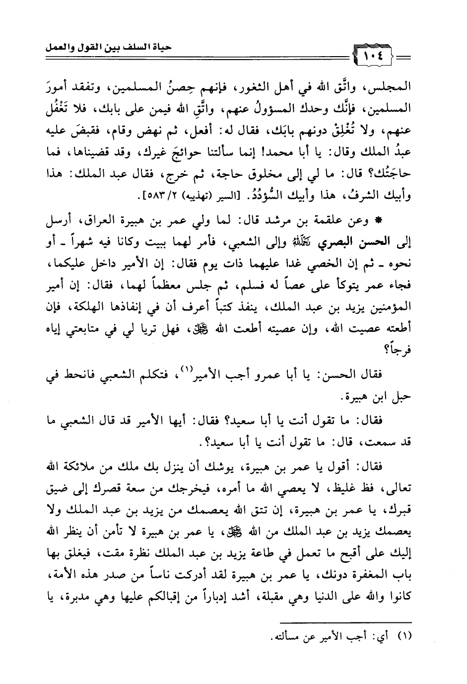 * وعن علقمة بن مرشد قال: لما ولي عمر بن هبيرة العراق، أرسل إلى الحسن البصري رحمه الله وإلى الشعبي، فأمر لهما ببيت وكانا فيه شهرًا - أو نحوه - ثم إن الخصي غدا عليهما ذات يوم فقال: إن الأمير داخل عليكما، فجاء عمر يتوكأ على عصًا له فسلم، ثم جلس معظمًا لهما، فقال: إن أمير المؤمنين يزيد بن عبد الملك، ينفذ كتبًا أعرف أن في إنفاذها الهلكة، فإن أطعته عصيت الله، وإن عصيته أطعت الله - عزَّ وجلَّ - فهل تريا لي في متابعتي إياه فرجًا؟
