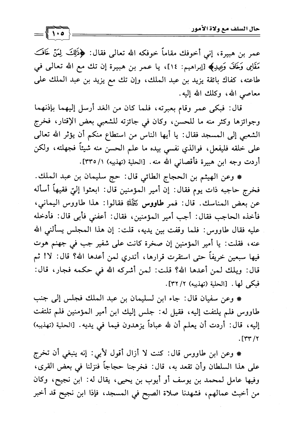 * وعن الهيثم بن الحجاج الطائي قال: حج سليمان بن عبد الملك. فخرج حاجبه ذات يوم فقال: إن أمير المؤمنين قال: ابعثوا إليّ فقيهًا أسأله عن بعض المناسك. قال: فمر طاووس رحمه الله فقالوا: هذا طاووس اليماني، فأخذه الحاجب فقال: أجب أمير المؤمنين، فقال: أعفني فأبى قال: فأدخله عليه فقال طاووس: فلما وقفت بين يديه، قلت: إن هذا المجلس يسألني الله عنه، فقلت: يا أمير المؤمنين إن صخرة كانت على شفير جب في جهنم هوت فيها سبعين خريفًا حتى استقرت قرارها، أتدري لمن أعدها الله؟ قال: لا! ثم قال: ويلك لمن أعدها الله؟ قلت: لمن أشركه الله في حكمه فجار قال: فبكى لها. [الحلية (تهذيبه) 2/ 32].