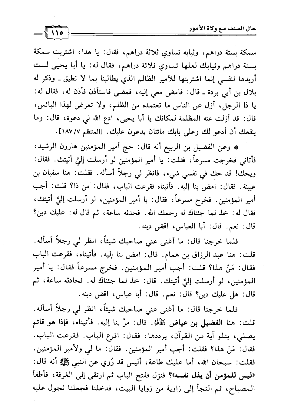 فلما خرجنا قال: ما أغنى عني صاحبك شيئًا، انظر لي رجلاً أسأله. قلت: هنا الفضيل بن عياض رحمه الله قال: مرَّ بنا إليه. فأتيناه، فإذا هو قائم يصلي، يتلو آية من القرآن، يرددها، فقال: اقرع الباب. فقرعت الباب. فقال: مَنْ هذا؟ فقلت: أجب أمير المؤمنين. فقال: ما لي ولأمير المؤمنين. فقلت: سبحان الله، أماعليك طاعة، أليس قد رُوي عن النبي - صلى الله عليه وسلم - أنه قال: (ليس للمؤمن أن يذل نفسه)؟ فنزل ففتح الباب ثم ارتقى إلى الغرفة، فأطفأ المصباح، ثم التجأ إلى زاوية من زوايا البيت، فدخلنا فجعلنا نجول عليه