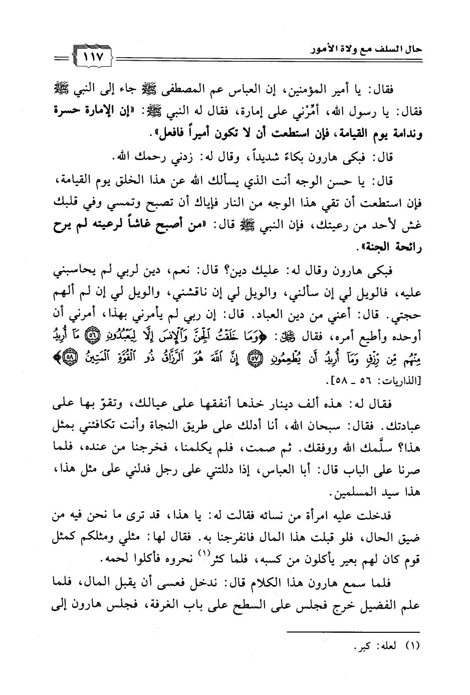 فبكى هارون وقال له: عليك دين؟ قال: نعم، دين لربي لم يحاسبني عليه، فالويل لي إن سألني، والويل لي إن ناقشني، والويل لي إن لم ألهم حجتي. قال: أعني من دين العباد. قال: إن ربي لم يأمرني بهذا، أمرني أن أوحده وأطيع أمره، فقال - عزَّ وجلَّ -: {وَمَا خَلَقْتُ الْجِنَّ وَالْإِنسَ إِلا لِيَعْبُدُونِ * مَا أُرِيدُ مِنْهُم مِّن رِّزْقٍ وَمَا أُرِيدُ أَن يُطْعِمُونِ * إِنَّ اللَّهَ هُوَ الرَّزَّاقُ ذُو الْقُوَّةِ الْمَتِينُ} [الذاريات: 56 - 58].