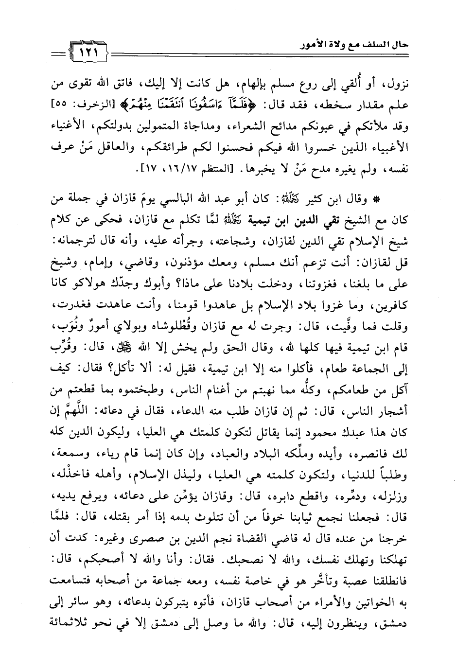 * وقال ابن كثير رحمه الله: كان أبو عبد الله البالسي يومَ قازان في جملة من كان مع الشيخ تقي الدين ابن تيمية رحمه الله لمَّا تكلم مع قازان، فحكى عن كلام شيخ الإسلام تقي الدين لقازان، وشجاعته، وجرأته عليه، وأنه قال لترجمانه: قل لقازان: أنت تزعم أنك مسلم، ومعك مؤذنون، وقاضي، وإمام، وشيخ على ما بلغنا، فغزوتنا، ودخلت بلادنا على ماذا؟ وأبوك وجدك هولاكو كانا كافرين، وما غزوا بلاد الإسلام بل عاهدوا قومنا، وأنت عاهدت فغدرت، وقلت فما وفَّيت، قال: وجرت له مع قازان وقُطْلوشاه وبولاي أمورٌ ونُوَب، قام ابن تيمية فيها كلها لله، وقال الحق ولم يخش إلا الله - عزَّ وجلَّ - قال: وقُرِّب إلى الجماعة طعام، فأكلوا منه إلا ابن تيمية، فقيل له: ألا تأكل؟ فقال: كيف آكل من طعامكم، وكلُّه مما نهبتم من أغنام الناس، وطبختموه بما قطعتم من أشجار الناس، قال: ثم إن قازان طلب منه الدعاء، فقال في دعائه: اللهم إن كان هذا عبدك محمود إنما يقاتل لتكون كلمتك هي العليا، وليكون الدين كله لك فانصره، وأيده وملِّكه البلاد والعباد، وإن كان إنما قام رياء، وسمعة، وطلبًا للدنيا، ولتكون كلمته هي العليا، وليذل الإسلام، وأهله فاخذْله، وزلزله، ودمِّره، واقطع دابره، قال: وقازان يؤمِّن على دعائه، ويرفع يديه، قال: فجعلنا نجمع ثيابنا خوفًا من أن تتلوث بدمه إذا أمر بقتله، قال: فلمَّا خرجنا من عنده قال له قاضي القضاة نجم الدين ابن صصرى وغيره: كدت أن تهلكنا وتهلك نفسك، والله لا نصحبك.