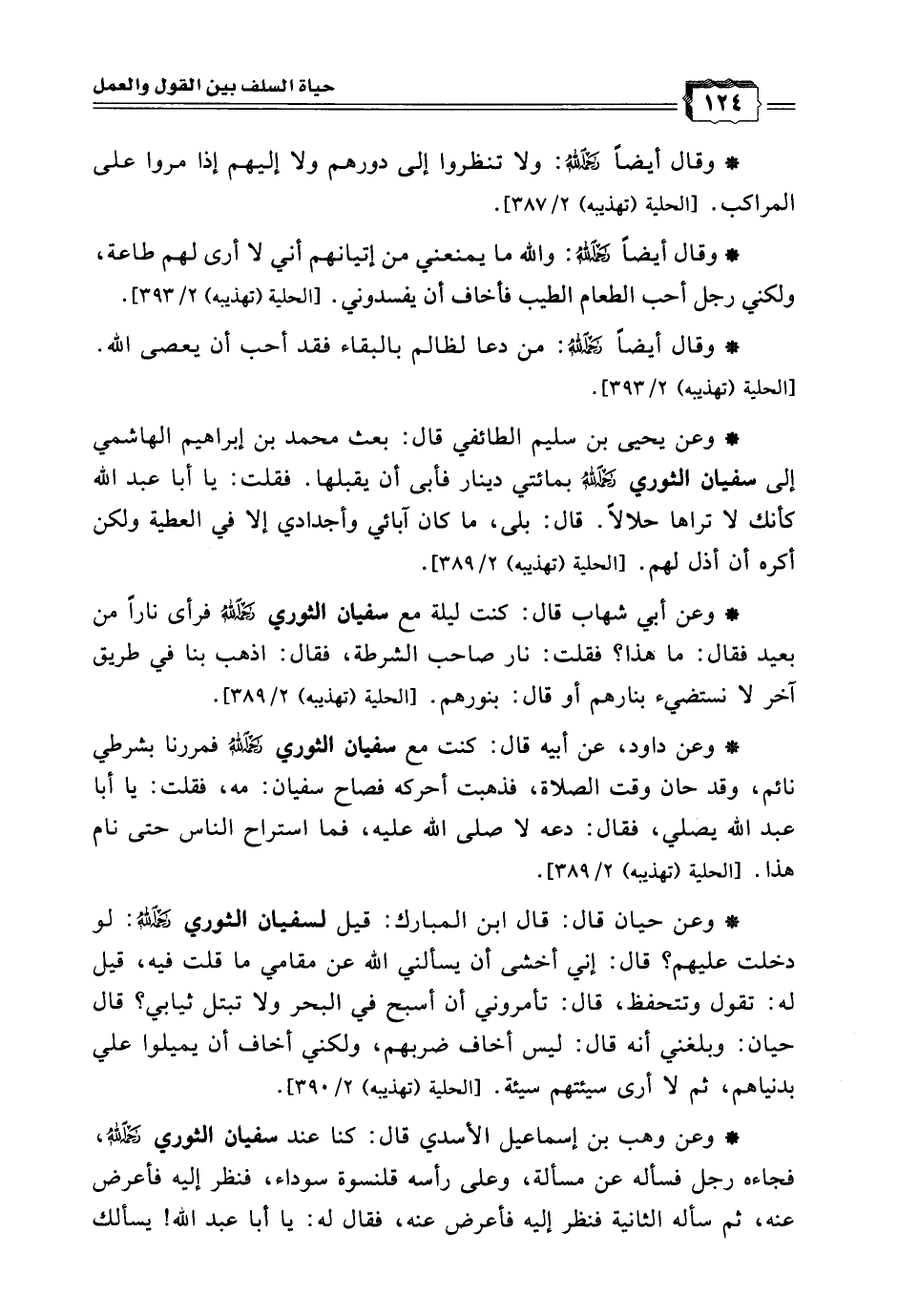 * وعن حيان قال: قال ابن المبارك: قيل لسفيان الثوري رحمه الله: لو دخلت عليهم؟ قال: إني أخشى أن يسألني الله عن مقامي ما قلت فيه، قيل له: تقول وتتحفظ، قال: تأمروني أن أسبح في البحر ولا تبتل ثيابي؟ قال حيان: وبلغني أنه قال: ليس أخاف ضربهم، ولكني أخاف أن يميلوا علي بدنياهم، ثم لا أرى سيئتهم سيئة. [الحلية (تهذيبه) 2/ 390].