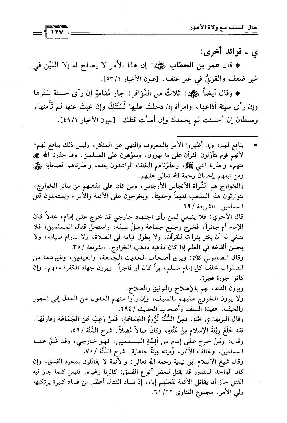 * وقال أيضًا - رضي الله عنه -: ثلاثٌ من الفَوَاقر: جار مُقامةٍ إن رأى حسنة سَتَرها وإن رأى سيئة أذاعها، وامرأة إن دخلتَ عليها لَسَنَتْكَ وإن غبتَ عنها لم تَامنها، وسلطان إن أحسنت لم يحمدك وإن أسأت قتلك. [عيون الأخبار 1/ 49].