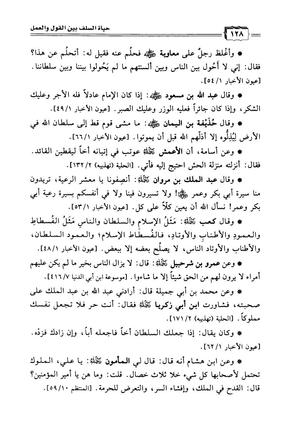 * وقال عبد الله بن مسعود - رضي الله عنه -: إذا كان الإمام عادلاً فله الأجر وعليك الشكر، وإذا كان جائرًا فعليه الوزر وعليك الصبر. [عيون الأخبار 1/ 49].