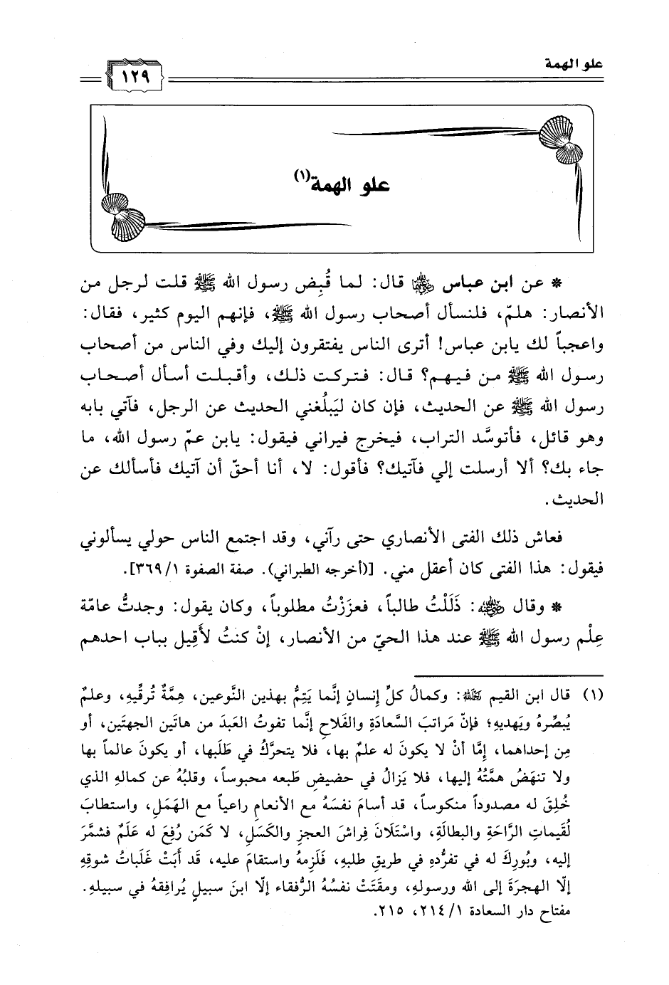 (¬1) قال ابن القيم رحمه الله: وكمالُ كلِّ إِنسانٍ إنَّما يَتِمُّ بهذين النَّوعين , هِمَّةٌ تُرقِّيهِ , وعلمٌ يُبصِّرهُ ويَهديهِ؛ فإنّ مَراتَب السَّعادَةِ والفَلاحِ إنَّما تفوتُ العَبدَ من هاتَين الجهتَين , أو مِن إحداهُما , إِمَّا أنْ لا يكونَ له علمٌ بها , فلا يتحرَّكُ في طَلَبها , أو يكونَ عالمًا بها ولا تنهَضُ همَّتُهُ إليها , فلا يَزالُ في حضيضِ طَبعه محبوسًا , وقلبُهُ عن كمالهِ الذي خُلِقَ له مصدودًا منكوسًا , قد أسامَ نفسَهُ مع الأنعامِ راعيًا مع الهَمَلِ , واستطابَ لُقَيماتِ الرَّاحَةِ والبطالَةِ , واسْتَلاَنَ فِراشَ العجزِ والكَسَلِ , لا كَمَن رُفِعَ له عَلَمٌ فشمَّرَ إليه , وبُورِكَ له في تفرُّدهِ في طريقِ طلبهِ , فَلَزِمهُ واستقامَ عليه , قَد أَبَتْ غَلَباتُ شوقِهِ إلاّ الهجرَةَ إلى الله ورسولهِ , ومقَتَتْ نفسُهُ الرُّفقاء إلاّ ابنَ سبيلٍ يُرافِقهُ في سبيلهِ. مفتاح دار السعادة 1/ 214، 215
