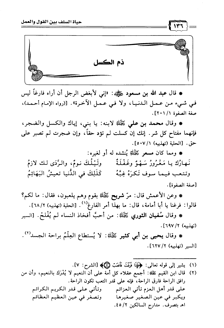 * قال عبد الله بن مسعود - رضي الله عنه -: "إني لأبغض الرجل أن أراه فارغًا ليس في شيء من عمل الدنيا، ولا في عمل الآخرة" [(رواه الإمام أحمد)، صفة الصفوة 1/ 201].