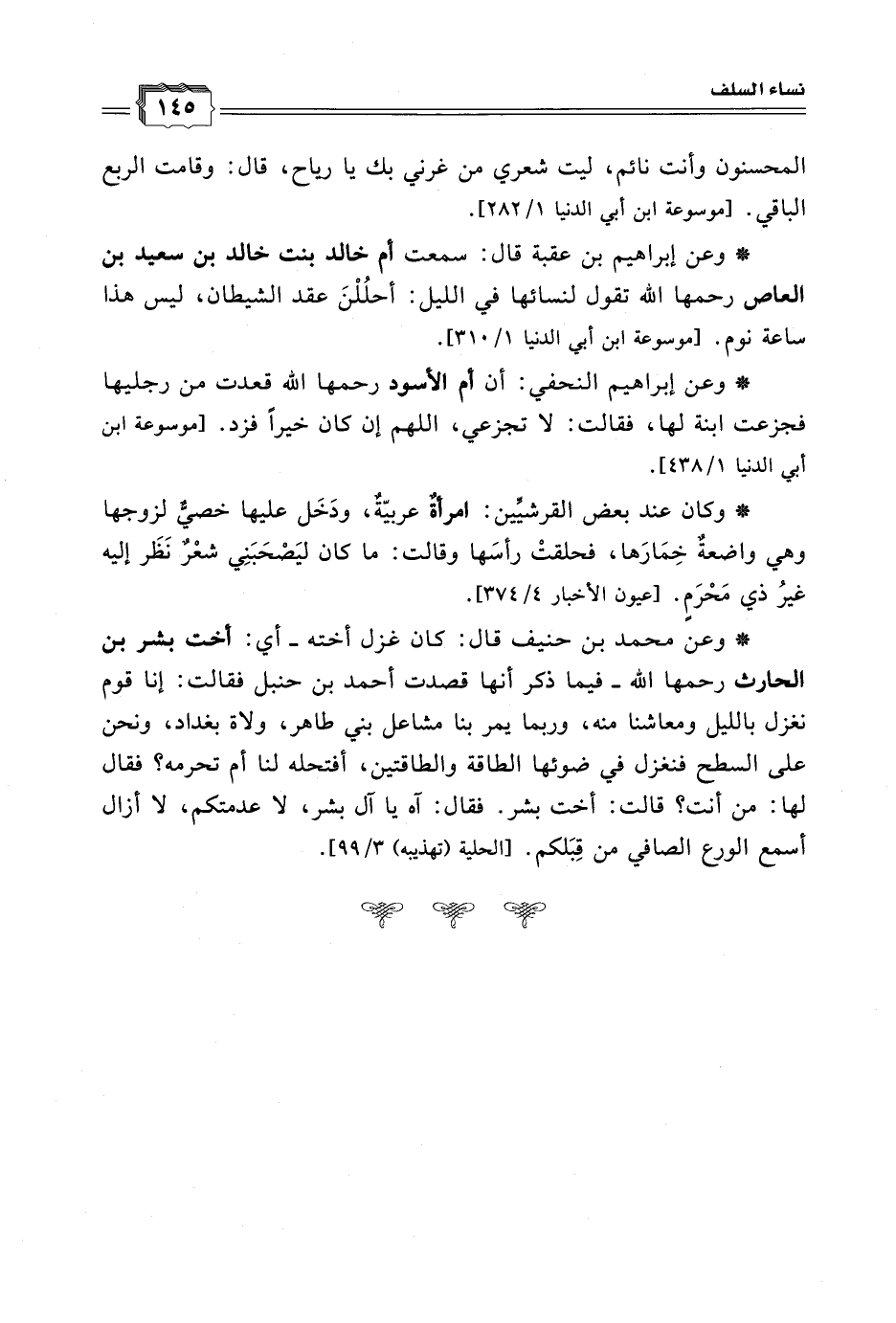 * وعن إبراهيم بن عقبة قال: سمعت أم خالد بنت خالد بن سعيد بن العاص رحمها الله تقول لنسائها في الليل: أحلُلْنَ عقد الشيطان، ليس هذا ساعة نوم. [موسوعة ابن أبي الدنيا 1/ 310].