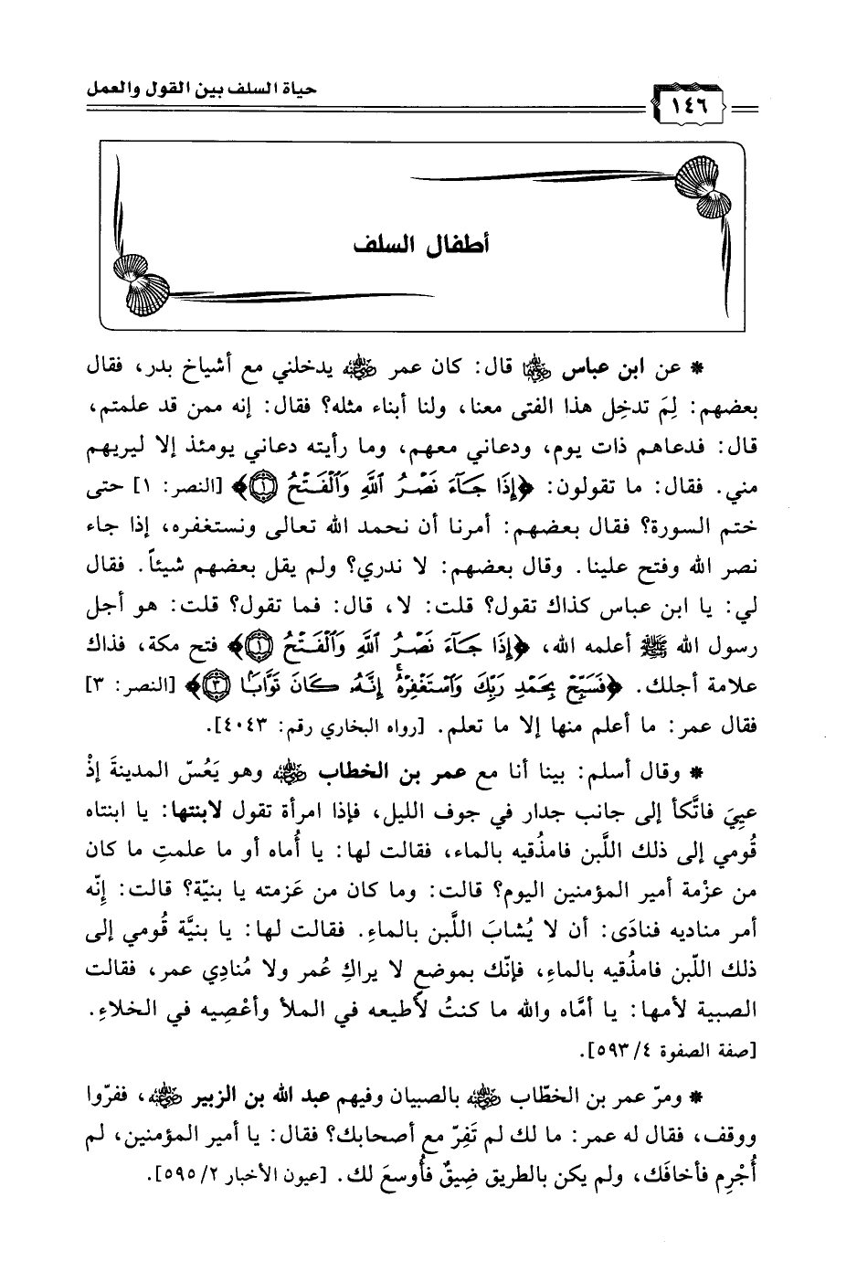 * عن ابن عباس - رضي الله عنهما - قال: كان عمر - رضي الله عنه - يدخلني مع أشياخ بدر، فقال بعضهم: لم تدخل هذا الفتى معنا، ولنا أبناء مثله؟ فقال: إنه ممن قد علمتم، قال: فدعاهم ذات يوم، ودعاني معهم، وما رأيته دعاني يومئذ إلا ليريهم مني. فقال: ما تقولون: {إِذَا جَاء نَصْرُ اللَّهِ وَالْفَتْحُ} [النصر: 1] حتى ختم السورة؟ فقال بعضهم: أمرنا أن نحمد الله تعالى ونستغفره، إذا جاء نصر الله وفتح علينا. وقال بعضهم: لا ندري؟ ولم يقل بعضهم شيئًا. فقال لي: يا ابن عباس كذاك تقول؟ قلت: لا، قال: فما تقول؟ قلت: هو أجل رسول الله - صلى الله عليه وسلم - أعلمه الله، {إِذَا جَاء نَصْرُ اللَّهِ وَالْفَتْحُ} فتح مكة، فذاك علامة أجلك. {فَسَبِّحْ بِحَمْدِ رَبِّكَ وَاسْتَغْفِرْهُ إِنَّهُ كَانَ تَوَّابًا} [النصر: 3] فقال عمر: ما أعلم منها إلا ما تعلم. [رواه البخاري رقم: 4043].