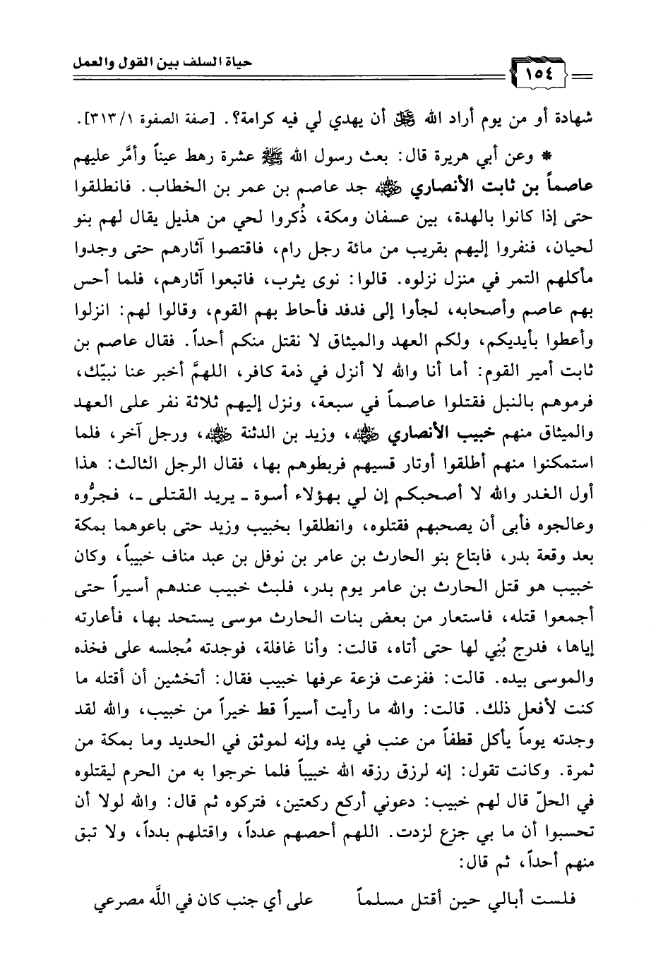 * وعن أبي هريرة - رضي الله عنه - قال: بعث رسول الله - صلى الله عليه وسلم - عشرة رهط عينًا وأمَّر عليهم عاصمًا بن ثابت الأنصاري - رضي الله عنه - جد عاصم بن عمر بن الخطاب. فانطلقوا حتى إذا كانوا بالهدة، بين عسفان ومكة، ذُكروا لحي من هذيل يقال لهم بنو لحيان، فنفروا إليهم بقريب من مائة رجل رام، فاقتصوا آثارهم حتى وجدوا مأكلهم التمر في منزل نزلوه. قالوا: نوى يثرب، فاتبعوا آثارهم، فلما أحس بهم عاصم وأصحابه، لجؤوا إلى فدفد فأحاط بهم القوم، وقالوا لهم: انزلوا وأعطوا بأيديكم، ولكم العهد والميثاق لا نقتل منكم أحدًا. فقال عاصم بن ثابت أمير القوم: أما أنا والله لا أنزل في ذمة كافر، اللهم أخبر عنا نبيك، فرموهم بالنبل فقتلوا عاصمًا في سبعة، ونزل إليهم ثلاثة نفر على العهد والميثاق منهم خبيب الأنصاري رضي الله عنه، وزيد بن الدثنة رضي الله عنه، ورجل آخر، فلما استمكنوا منهم أطلقوا أوتار قسيهم فربطوهم بها فقال الرجل الثالث: هذا أول الغدر والله لا أصحبكم إن لي بهؤلاء أسوة - يريد القتلى - فجرَّوه وعالجوه فأبى أن يصحبهم فقتلوه، وانطلقوا بخبيب وزيد حتى باعوهما بمكة بعد وقعة بدر، فابتاع بنو الحارث بن عامر بن نوفل بن عبد مناف خبيبًا، وكان خبيب هو قتل الحارث بن عامر يوم بدر، فلبث خبيب عندهم أسيرًا حتى أجمعوا قتله، فاستعار من بعض بنات الحارث موسى يستحد بها، فأعارته إياها، فدرج بني لها حتى أتاه قالت: وأنا غافلة فوجدته مجلسه على فخذه والموسى بيده. قالت: ففزعت فزعة عرفها خبيب فقال: أتخشين أن أقتله ما كنت لأفعل ذلك. قالت: والله ما رأيت أسيرًا قط خيراً من خبيب، والله لقد وجدته يومًا يأكل قطفًا من عنب في يده وإنه لموثق في الحديد وما بمكة من ثمرة. وكانت تقول: إنه لرزق رزقه الله خبيبًا فلما خرجوا به من الحرم ليقتلوه في الحلّ قال لهم خبيب: