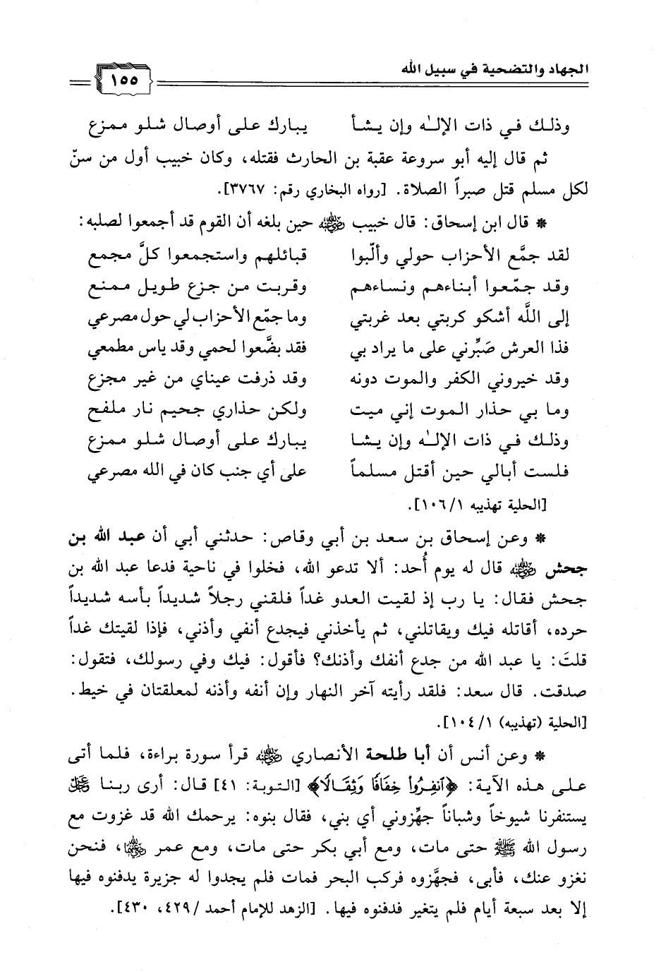 * وعن أنس أن أبا طلحة الأنصاري - رضي الله عنه - قرأ سورة براءة فلما أتى على هذه الآية: {انفرُوا خِفَافَا وَثِقَالاً} [التوبة: 41] قال: أرى ربنا - عزَّ وجلَّ - يستنفرنا شيوخًا وشبانًا جهزوني أي بني، فقال بنوه: يرحمك الله قد غزوت مع رسول الله - صلى الله عليه وسلم - حتى مات ومع أبي بكر حتى مات ومع عمر - رضي الله عنهما - فنحن نغزو عنك، فأبى فجهزوه فركب البحر فمات فلم يجدوا له جزيرة يدفنوه فيها إلا بعد سبعة أيام فلم يتغير فدفنوه فيها. [الزهد للإمام أحمد / 429 - 430].