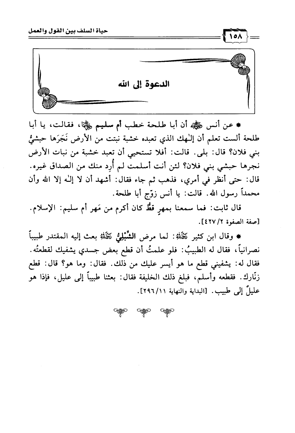 * عن أنس - رضي الله عنه - أن أبا طلحة خطب أم سليم رضي الله عنها، فقالت، يا أبا طلحة ألست تعلم أن إلهك الذي تعبده خشبة نبتت من الأرض نَجَرَها حبشيُّ بني فلان؟ قال: بلى. قالت: أفلا تستحيي أن تعبد خشبة من نبات الأرض نجرها حبشي بني فلان؟ لئن أنت أسلمت لم أُرِد منك من الصداق غيره. قال: حتى أنظر في أمري، فذهب ثم جاء فقال: أشهد أن لا إله إلا الله وأن محمدًا رسول الله. قالت: يا أنس زوّج أبا طلحة.