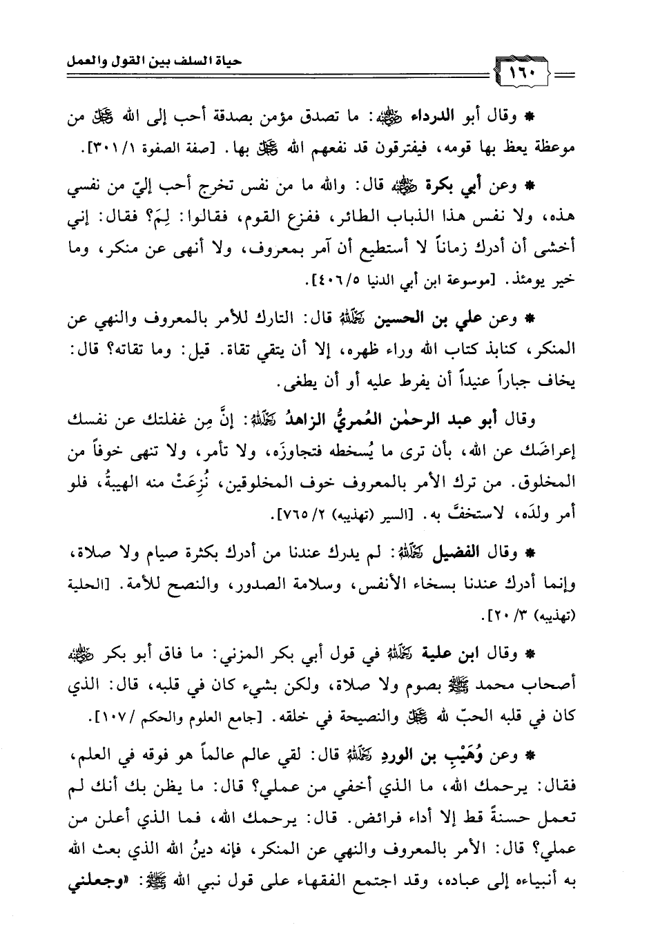 * وعن وُهَيْبِ بن الوردِ رحمه الله قال: لقي عالم عالمًا هو فوقه في العلم، فقال: يرحمك الله، ما الذي أخفي من عملي؟ قال: ما يظن بك أنك لم تعمل حسنةً قط إلا أداء فرائض. قال: يرحمك الله، فما الذي أعلن من عملي؟ قال: الأمر بالمعروف والنهي عن المنكر، فإنه دينُ الله الذي بعث الله به أنبياءه إلى عباده، وقد اجتمع الفقهاء على قول نبي الله - صلى الله عليه وسلم -: (وجعلني