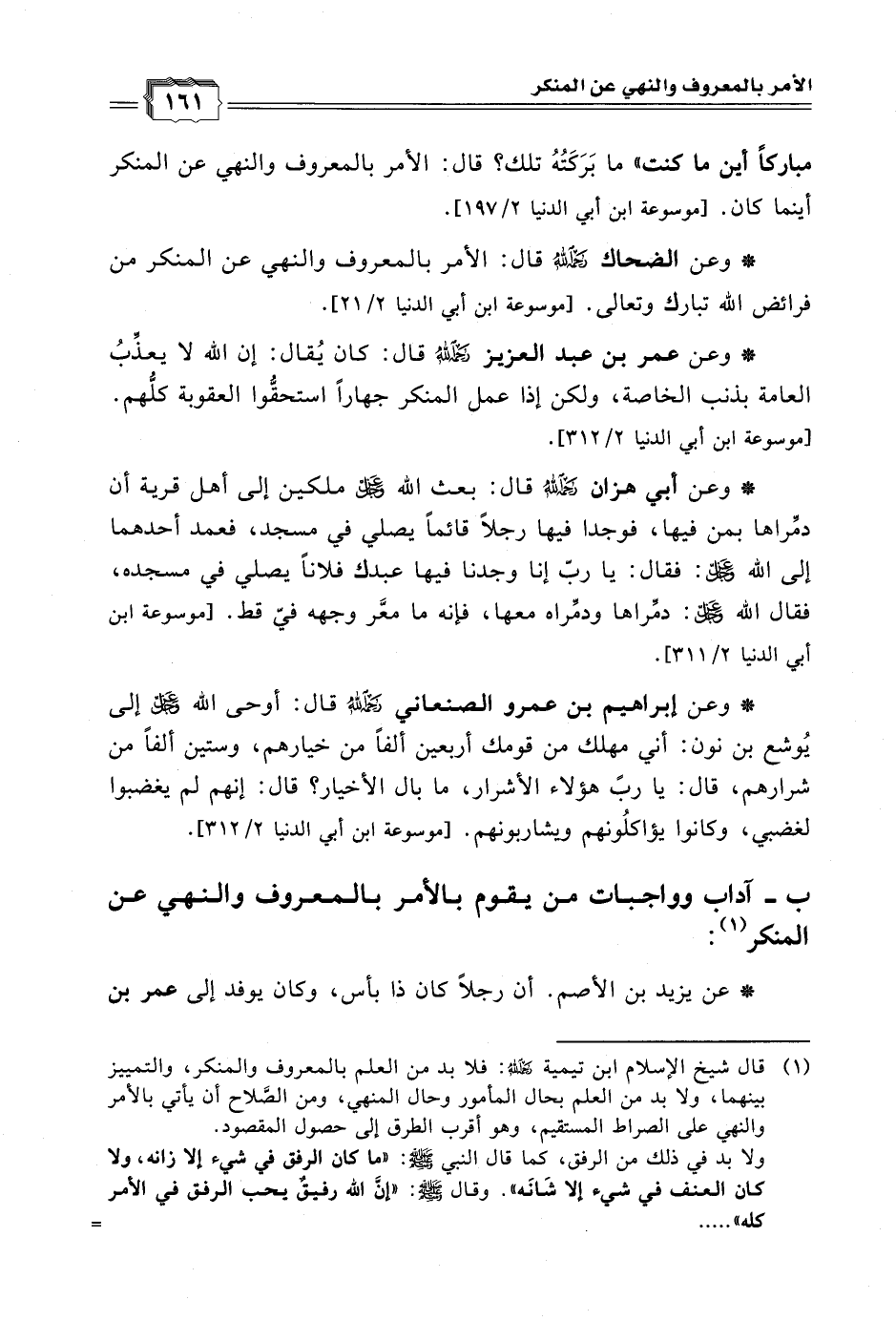 (¬1) قال شيخ الإسلام ابن تيمية رحمه الله: فلابد من العلم بالمعروف والمنكر , والتمييز بينهما , ولا بد من العلم بحال المأمور وحال المنهي , ومن الصَّلاح أن يأتي بالأمر والنهي على الصراط المستقيم , وهو أقرب الطرق إلى حصول المقصود.