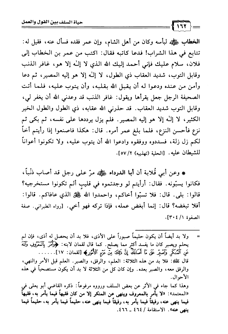 * وعن أبي قُلابة أن أبا الدرداء - رضي الله عنه - مرّ على رجل قد أصاب ذنْبًا، فكانوا يسبّونه. فقال: أرأيتم لو وجدتموه في قليبٍ ألم تكونوا مستخرجيه؟ قالوا: بلى. قال: فلا تسبّوا أخاكم، واحمدوا الله - عزَّ وجلَّ - الذي عافاكم. قالوا: أفلا تبغضه؟ قال: إنما أبغض عمله، فإذا تركه فهو أخي. [رواه الطبراني. صفة الصفوة 1/ 304].