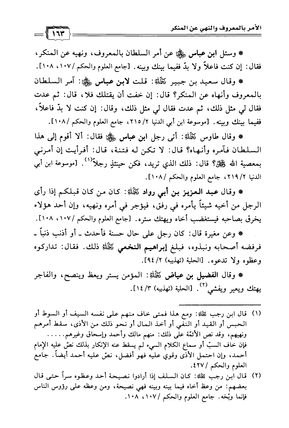 * وقال سعيد بن جبير رحمه الله: قلت لابن عباس - رضي الله عنه -: آمر السلطان بالمعروف وأنهاه عن المنكر؟ قال: إن خفت أن يقتلك فلا، قال: ثم عدت فقال لي مثل ذلك، ثم عدت فقال لي مثل ذلك، وقال: إن كنت لا بدّ فاعلاً، ففيما بينك وبينه. [موسوعة ابن أبي الدنيا 2/ 215، جامع العلوم والحكم / 108].