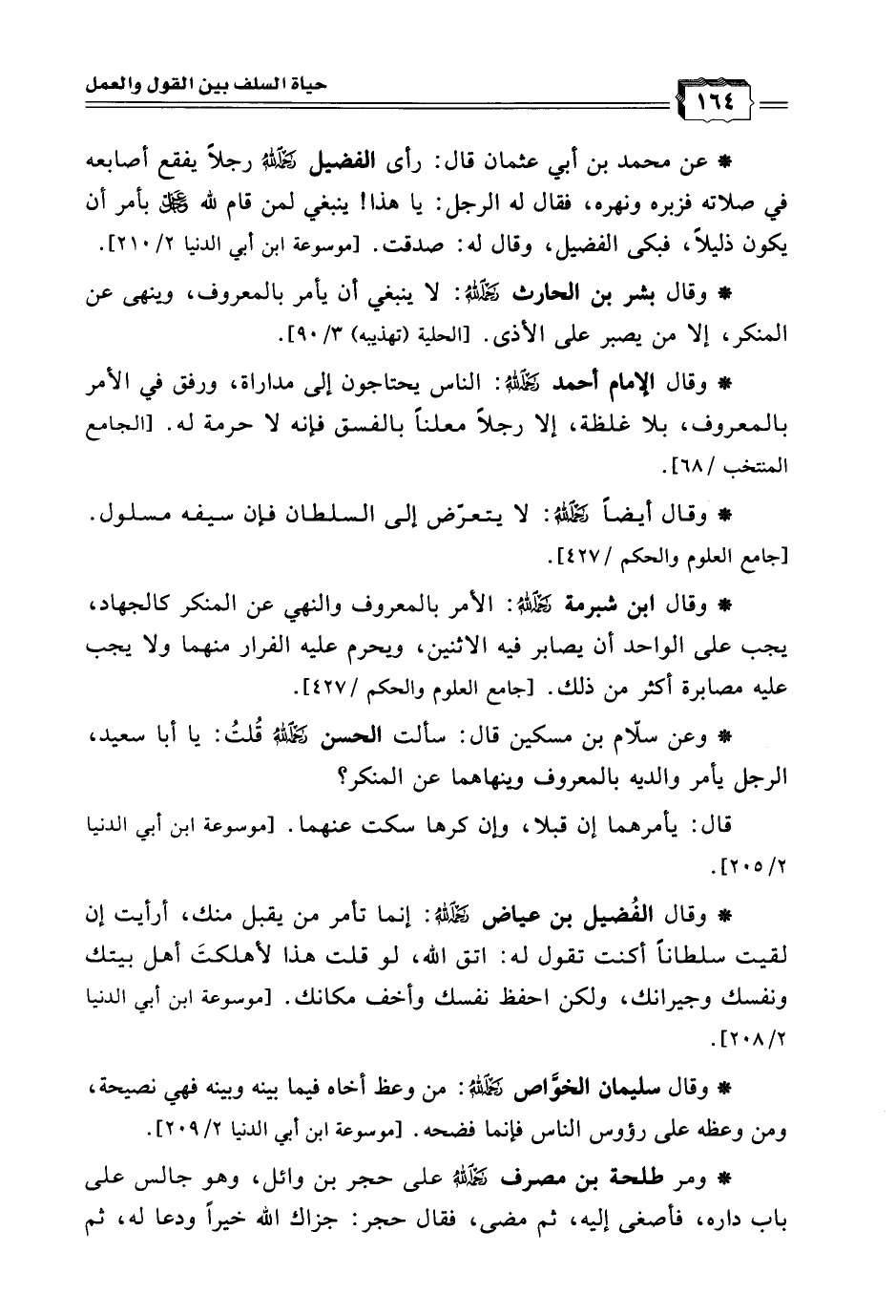 * وقال بشر بن الحارث رحمه الله: لا ينبغي أن يأمر بالمعروف، وينهى عن المنكر، إلا من يصبر على الأذى. [الحلية (تهذيبه) 3/ 90].