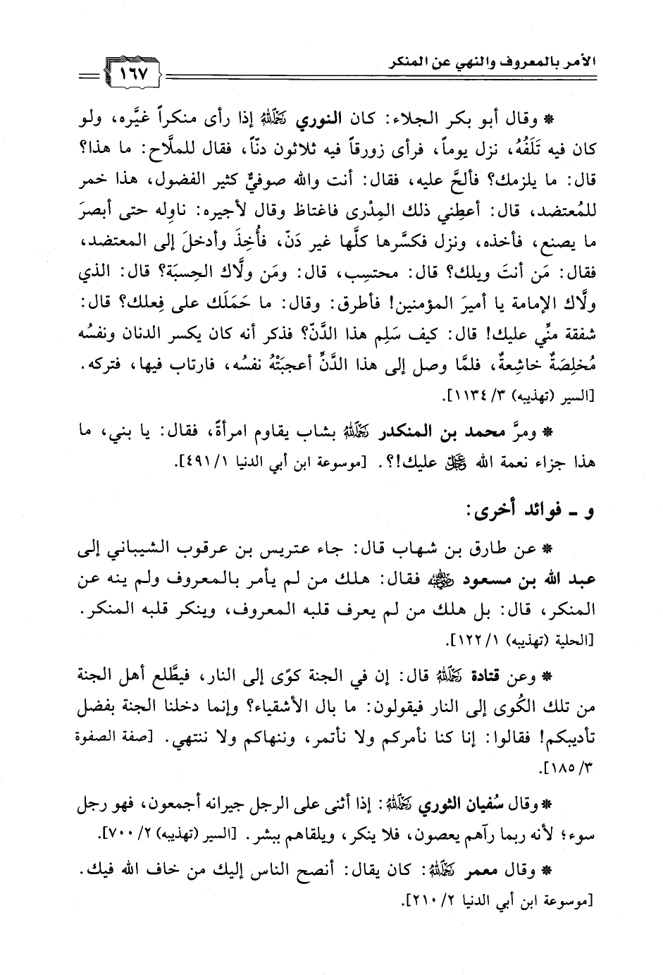 * عن طارق بن شهاب قال: جاء عتريس بن عرقوب الشيباني إلى عبد الله بن مسعود - رضي الله عنه - فقال: هلك من لم يأمر بالمعروف ولم ينه عن المنكر، قال: بل هلك من لم يعرف قلبه المعروف، وينكر قلبه المنكر. [الحلية (تهذيبه) 1/ 122].