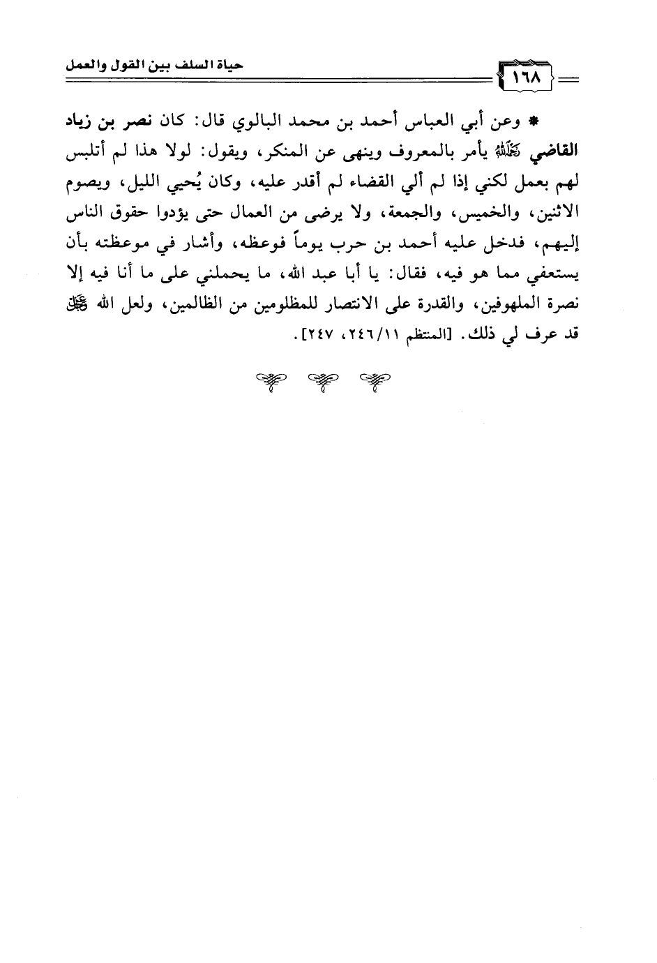 * وعن أبي العباس أحمد بن محمد البالوي قال: كان نصر بن زياد القاضي رحمه الله يأمر بالمعروف وينهى عن المنكر، ويقول: لولا هذا لم أتلبس لهم بعمل لكني إذا لم ألي القضاء لم أقدر عليه، وكان يُحيي الليل، ويصوم الاثنين، والخميس، والجمعة، ولا يرضى من العمال حتى يؤدوا حقوق الناس إليهم، فدخل عليه أحمد بن حرب يومًا فوعظه، وأشار في موعظته بأن يستعفي مما هو فيه، فقال: يا أبا عبد الله، ما يحملني على ما أنا فيه إلا نصرة الملهوفين، والقدرة على الانتصار للمظلومين من الظالمين، ولعل الله - عزَّ وجلَّ - قد عرف لي ذلك. [المنتظم 11/ 246، 247].