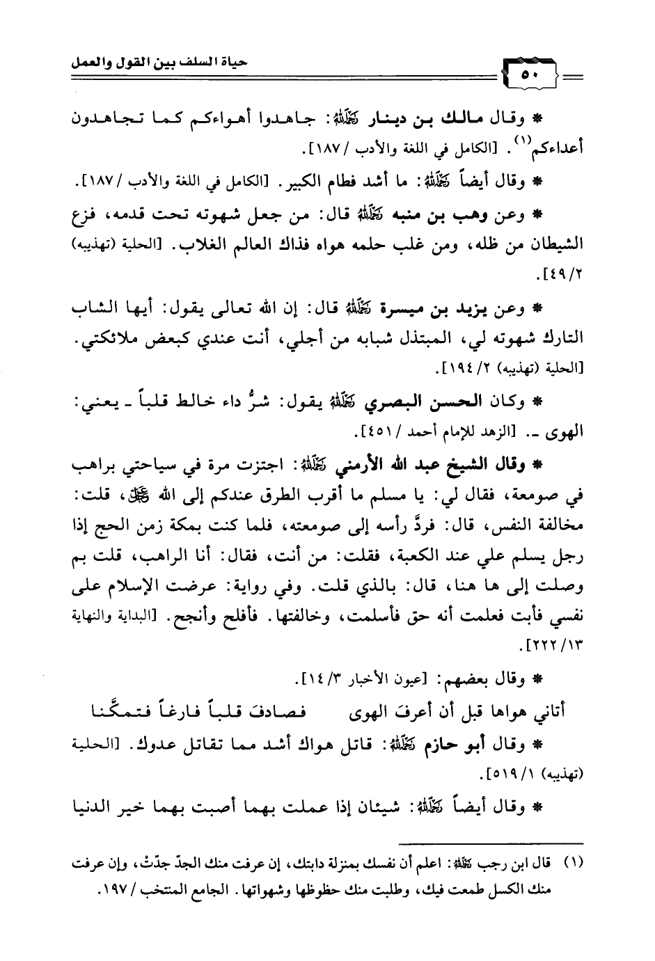 * وقال أبو حازم رحمه الله: قاتل هواك أشد مما تقاتل عدوك. [الحلية (تهذيبه) 1/ 519].