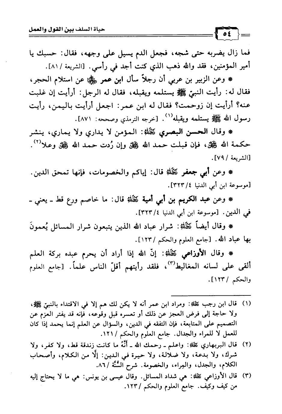 (¬2) قال البربهاري رحمه الله: واعلم - رحمك الله - أَنَّهُ ما كانت زندقة قط , ولا كفر , ولا شرك , ولا بدعة , ولا ضلالة , ولا حيرة في الدين: إلاَّ من الكلام , وأصحاب الكلام , والجدل , والمِراء , والخصومة. شرح السنة / 86.