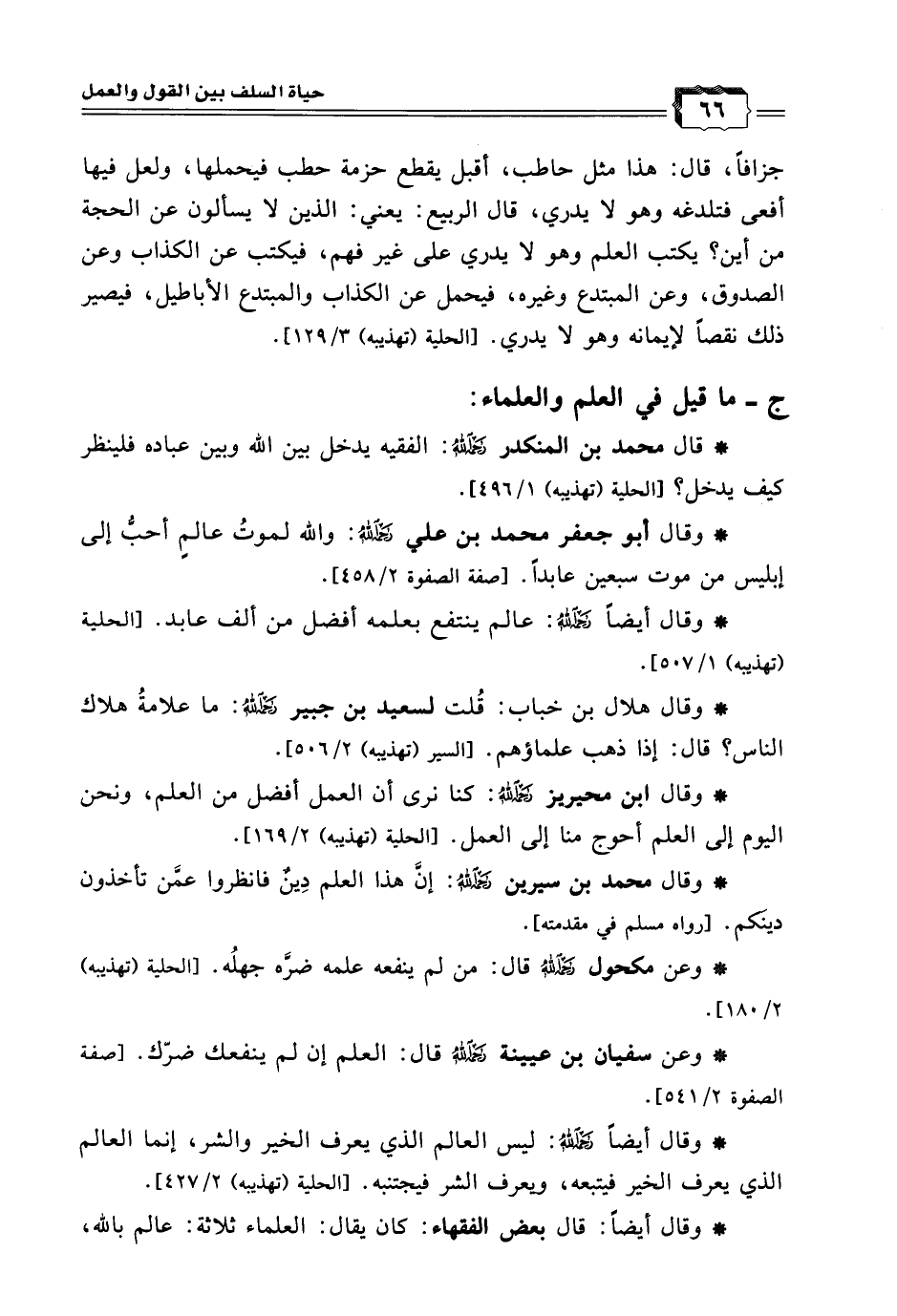 * وقال أيضًا رحمه الله: ليس العالم الذي يعرف الخير والشر، إنما العالم الذي يعرف الخير فيتبعه، ويعرف الشر فيجتنبه. [الحلية (تهذيبه) 2/ 427].