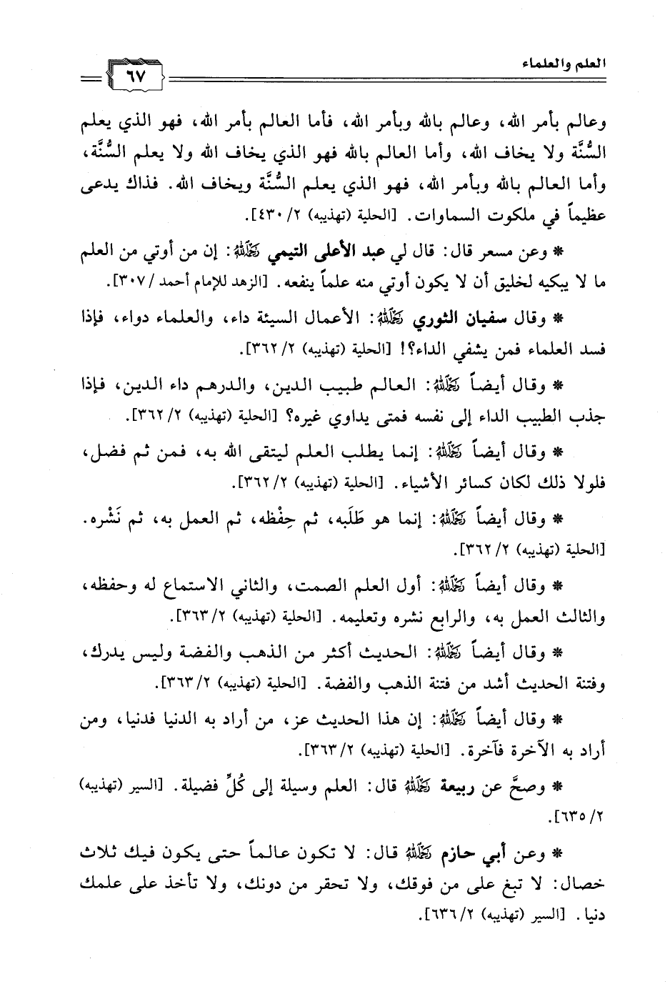 وعالم بأمر الله، وعالم بالله وبأمر الله، فأما العالم بأمر الله، فهو الذي يعلم السنة ولا يخاف الله، وأما العالم بالله فهو الذي يخاف الله ولا يعلم السُّنَّة، وأما العالم بالله وبأمر الله، فهو الذي يعلم السنة ويخاف الله. فذاك يدعى عظيمًا في ملكوت السماوات. [الحلية (تهذيبه) 2/ 430].