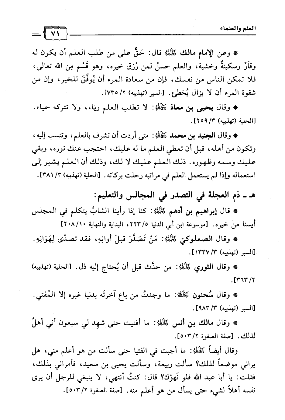 * وقال الجنيد بن محمد رحمه الله: متى أردت أن تشرف بالعلم، وتنسب إليه، وتكون من أهله، قبل أن تعطي العلم ماله عليك، احتجب عنك نوره، وبقي عليك وسمه وظهوره. ذلك العلم عليك لا لك، وذلك أن العلم يشير إلى استعماله وإذا لم يستعمل العلم في مراتبه رحلت بركاته. [الحلية (تهذيبه) 3/ 381].